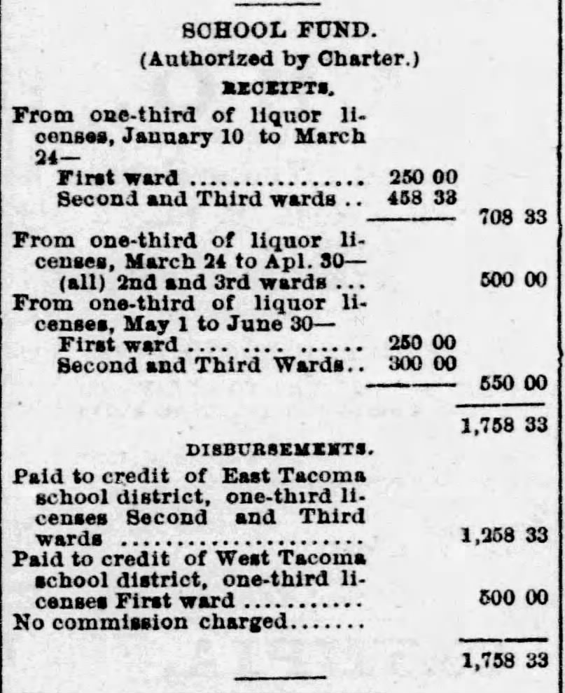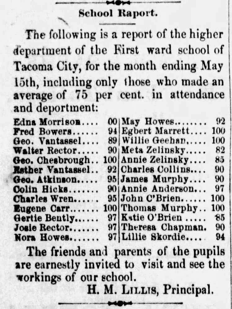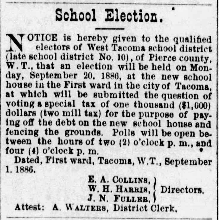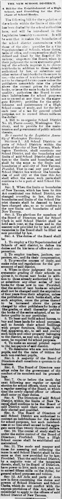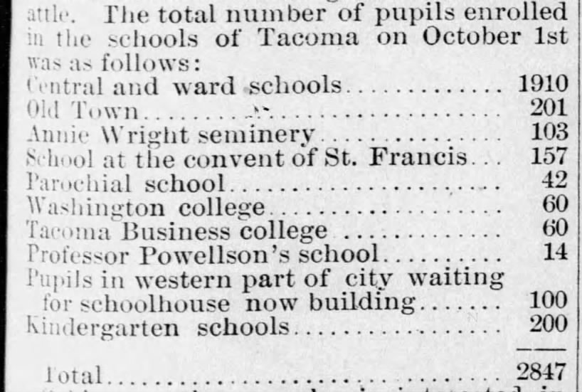 “The present school district of Tacoma does not comprise the first ward or “Old Town,” inasmuch as the residents of that portion of the city having the Tacoma mill and other large industries did not care to be joined to the same district as Tacoma when it was young and not self-sustaining, but now the conditions have changed and the revenues are largely in excess of the expenditures and at no distant day the first ward will be included by common consent in one district, composed of the First, Second, Third and Fourth wards. In these latter three wards there are four houses completed and occupied, while another now being erected on south K street will be ready for occupancy by November 15th.”