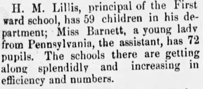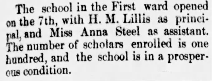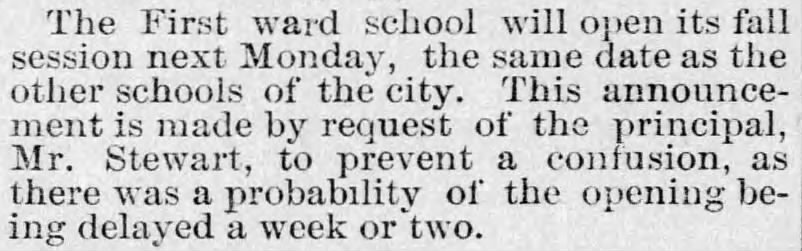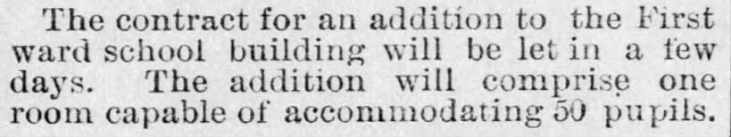 The Principal of the First ward school is now Mr. Stewart. It is unclear who Mr. Stewart is – it could be Matthew Stewart, who was listed as one of Principal Lillis’ assistants in 1888, or it could be J. P. Stewart, who was a teacher in the original First ward school building when it was still a one-room school house.