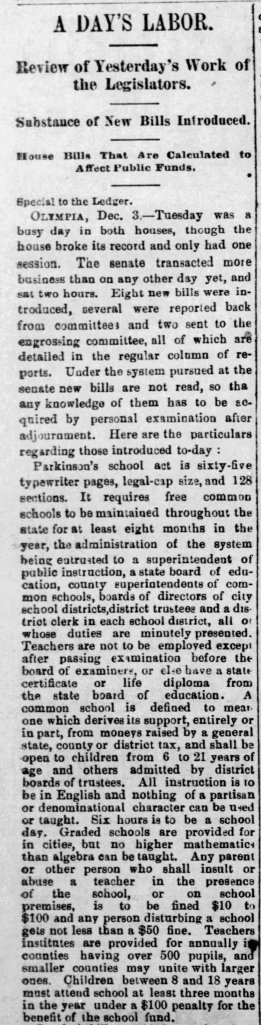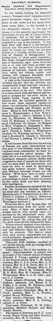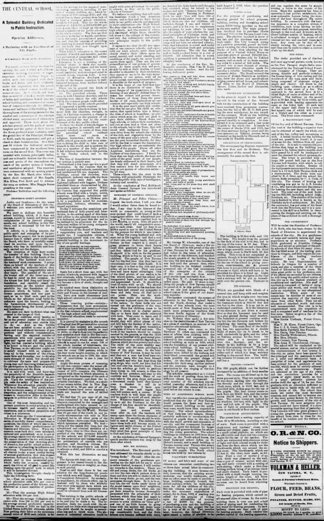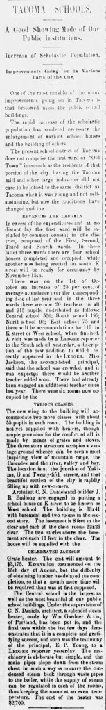 This is an extensive article about the newly-built Central School. While it doesn’t discuss the First ward (Lowell) school, it gives a good idea about the state of education in the cities of Old and New Tacoma at this time.