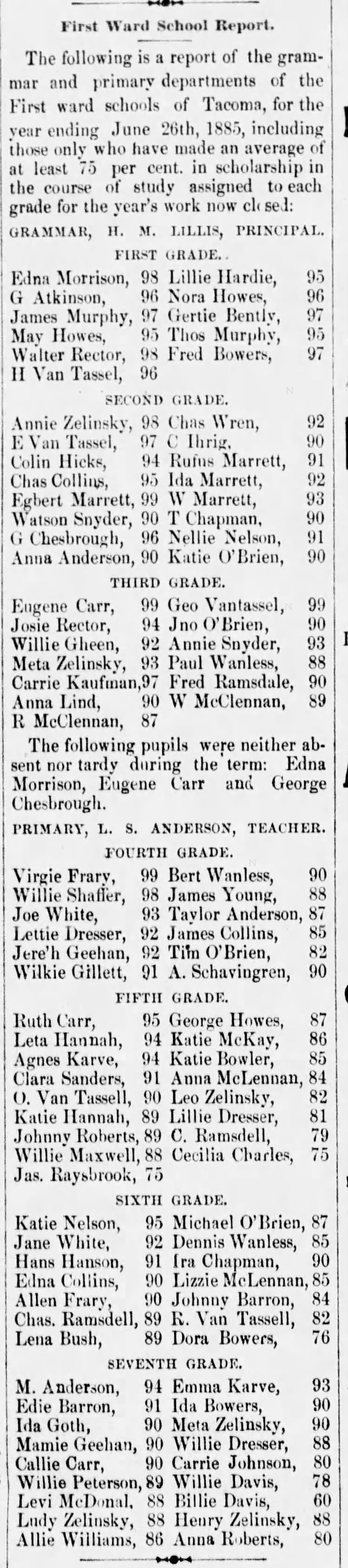 At this time, the school included grades 1-7. Principal Lillis taught the 1st-3rd grades, while L.S. Anderson taught grades 4-7.