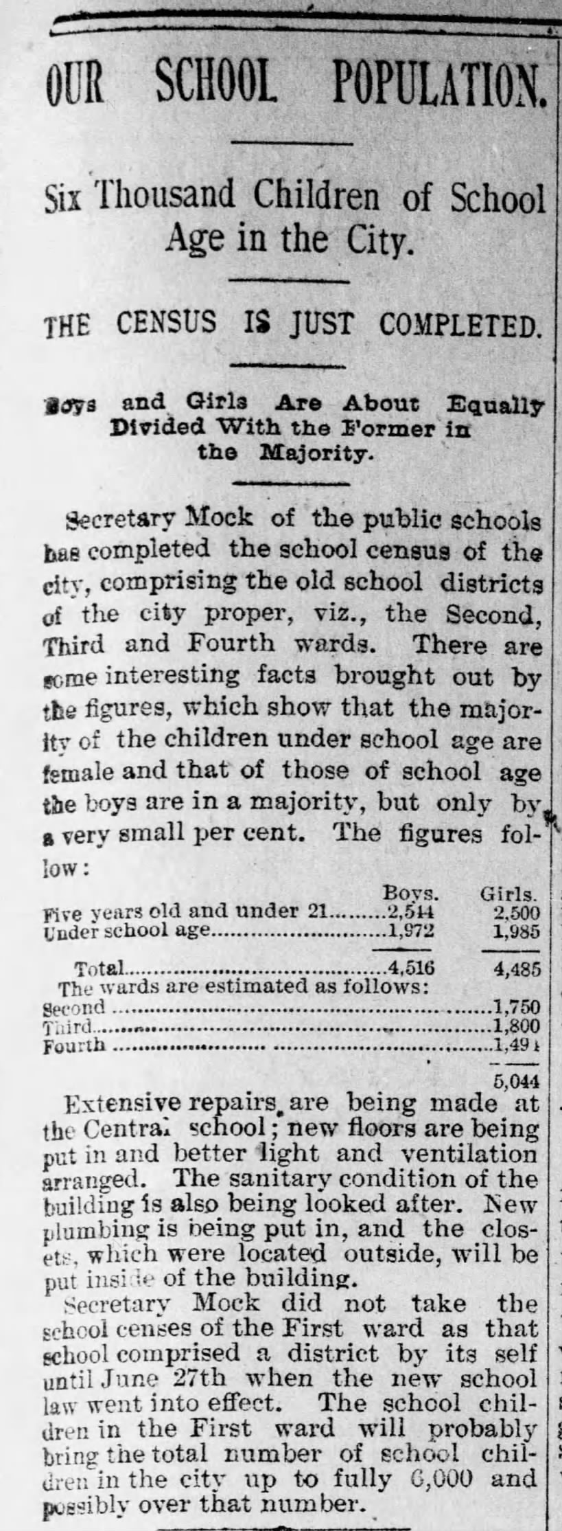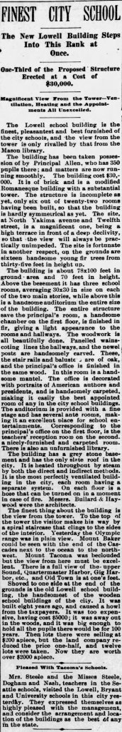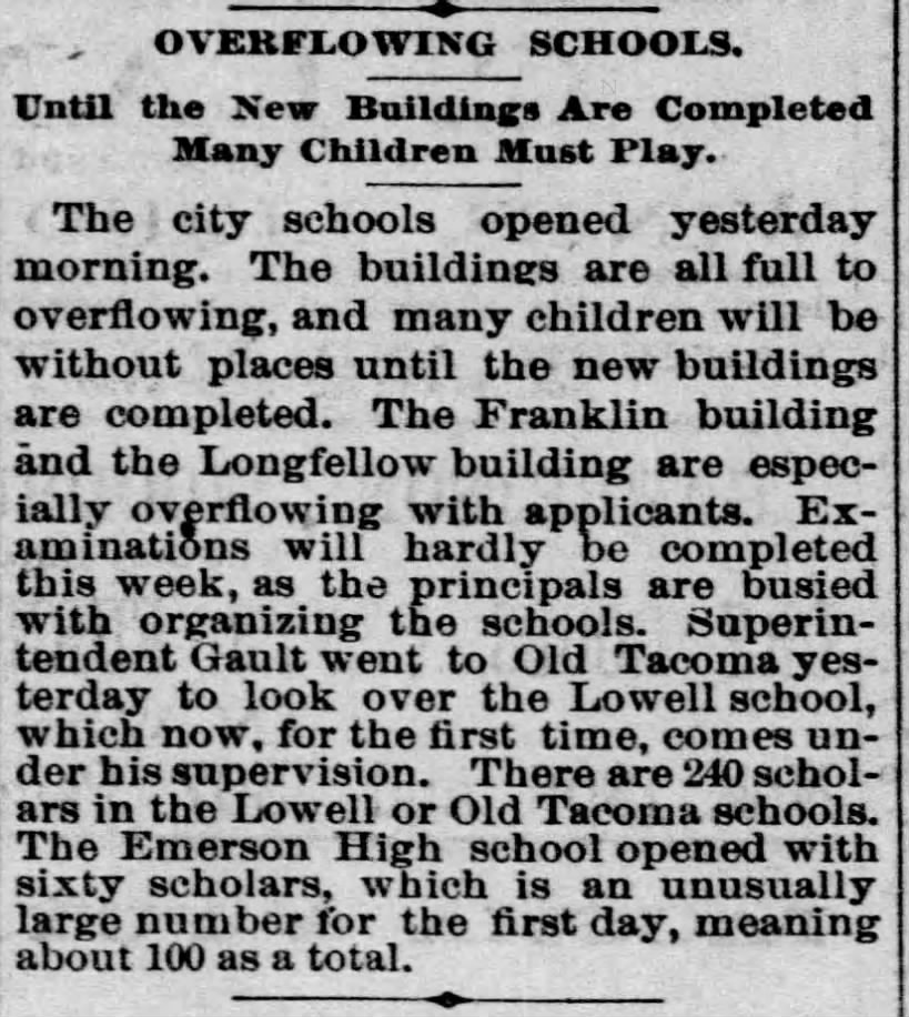 An article about the number of school-age children in Tacoma. Lowell was not named Lowell yet, at this time it was called Old Town School, or (as it is here) referred to as the First ward school.