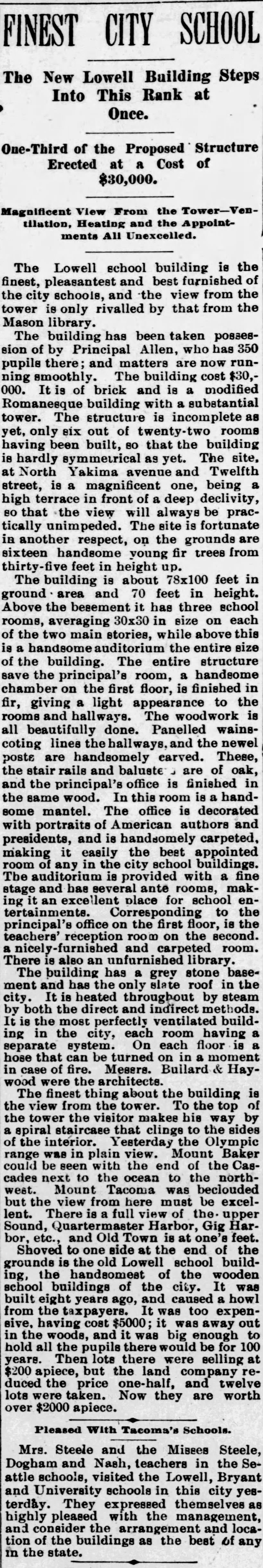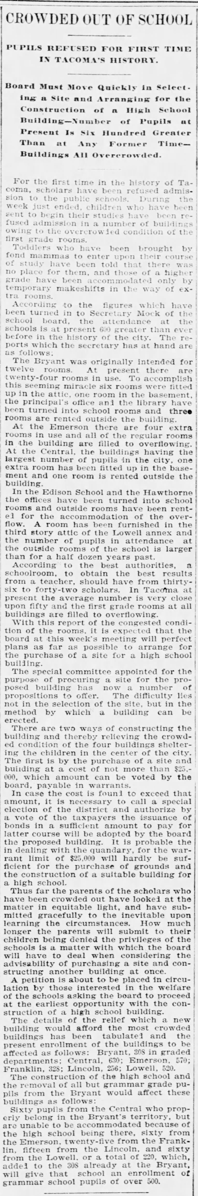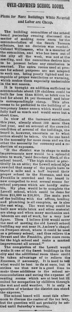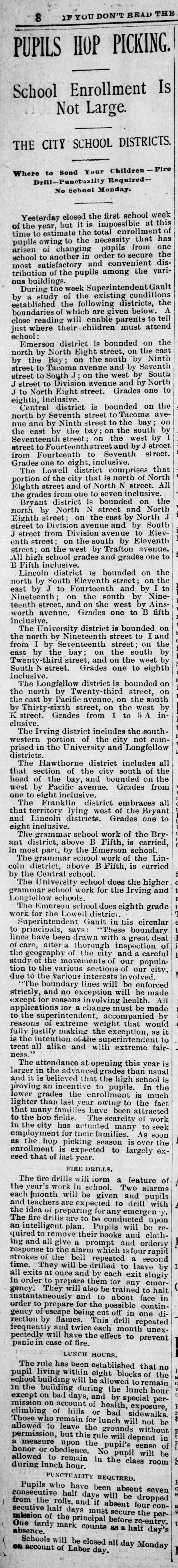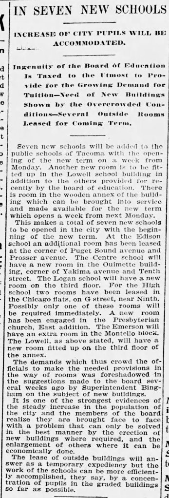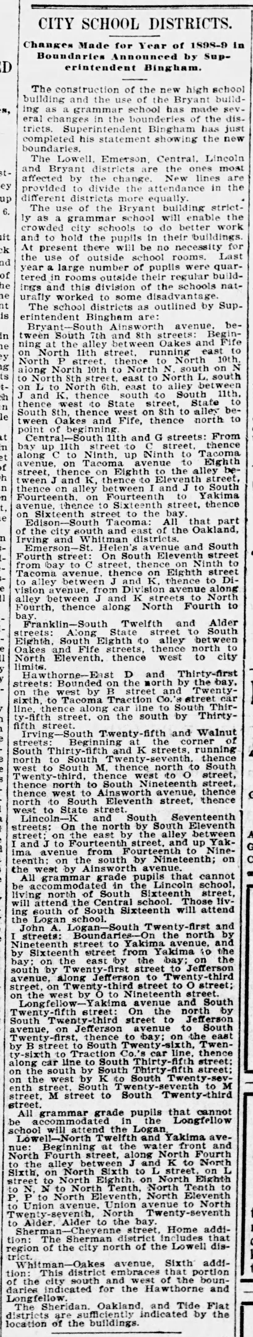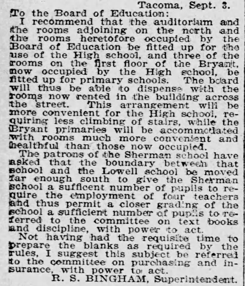 Tacoma schools Superintendent R.S. Bingham recommends adjusting the boundaries of the Lowell and Sherman districts “to give the Sherman school a sufficient number of pupils to require the employment of four teachers and thus permit a closer grading of the school a sufficient number of pupils to referred to the committee on text books and discipline, with power to act.”