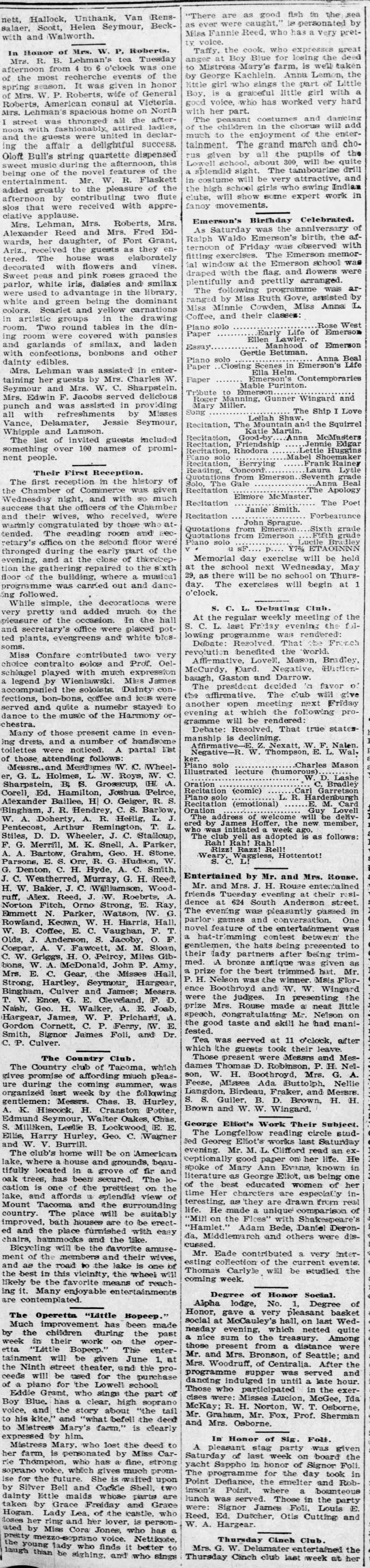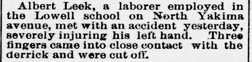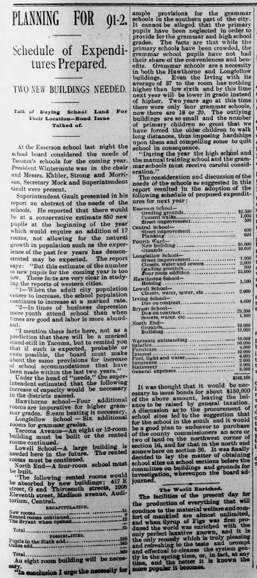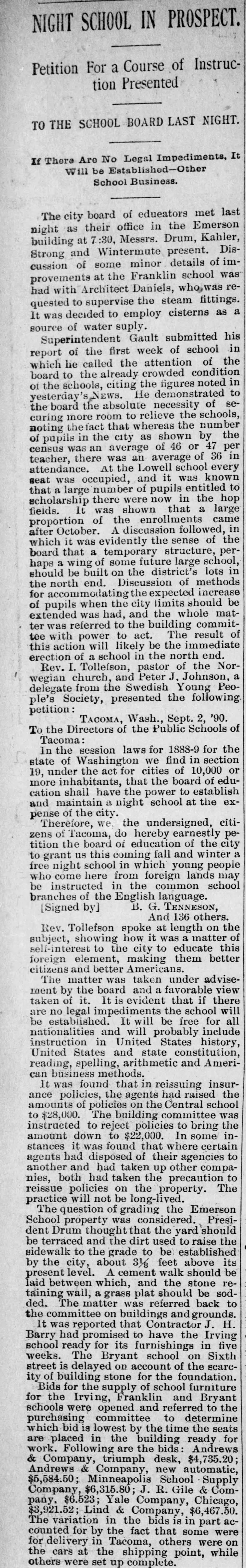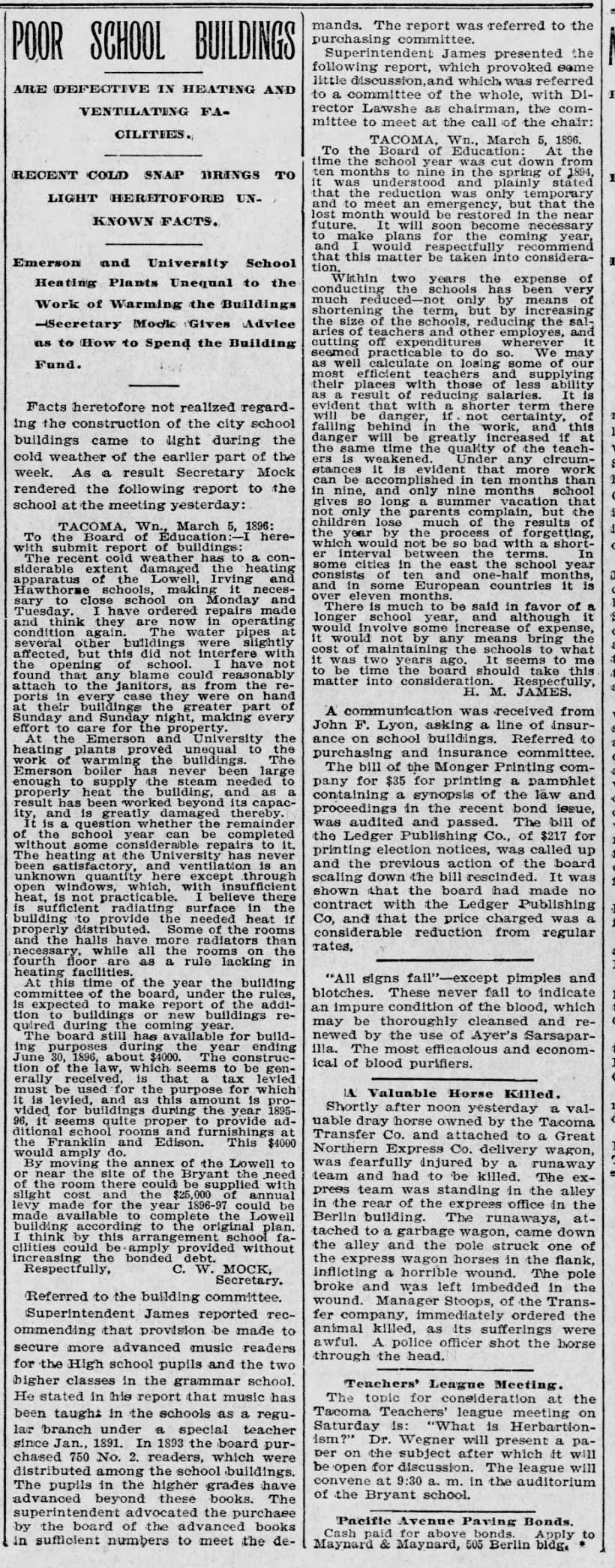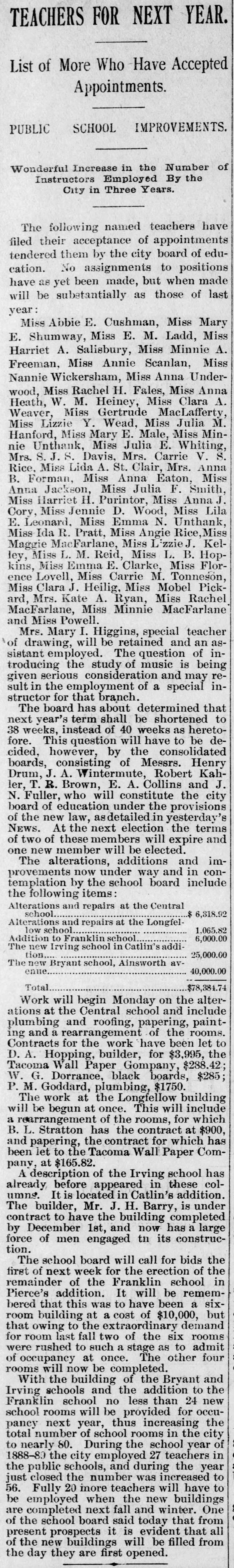 Tacoma schools Superintendent R.S. Bingham recommends adjusting the boundaries of the Lowell and Sherman districts “to give the Sherman school a sufficient number of pupils to require the employment of four teachers and thus permit a closer grading of the school a sufficient number of pupils to referred to the committee on text books and discipline, with power to act.”