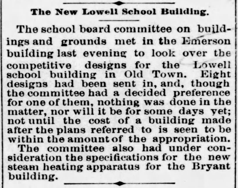 The school board met once again to discuss the new Lowell building, and decided on building plans submitted by Bullard & Haywood.
