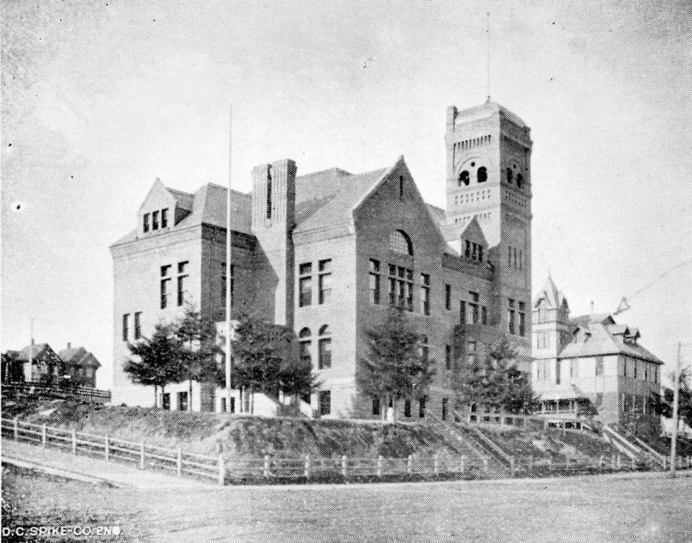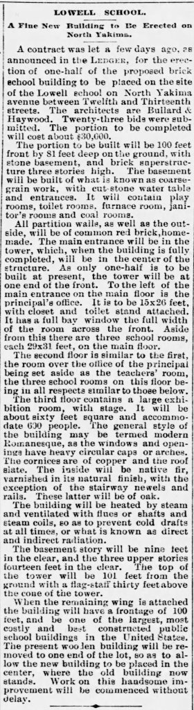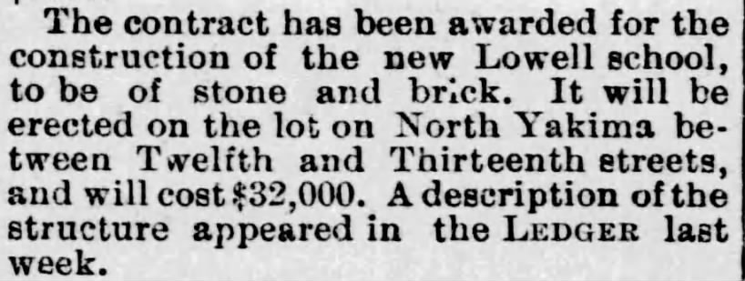 Lowell as seen c. 1893 from North 12th and Yakima streets. The new building is in the foreground – the old building (which became the annex) is behind it, to the right. The old building was previously in the center of of the lot – but it was moved to the side to make way for the new building.
