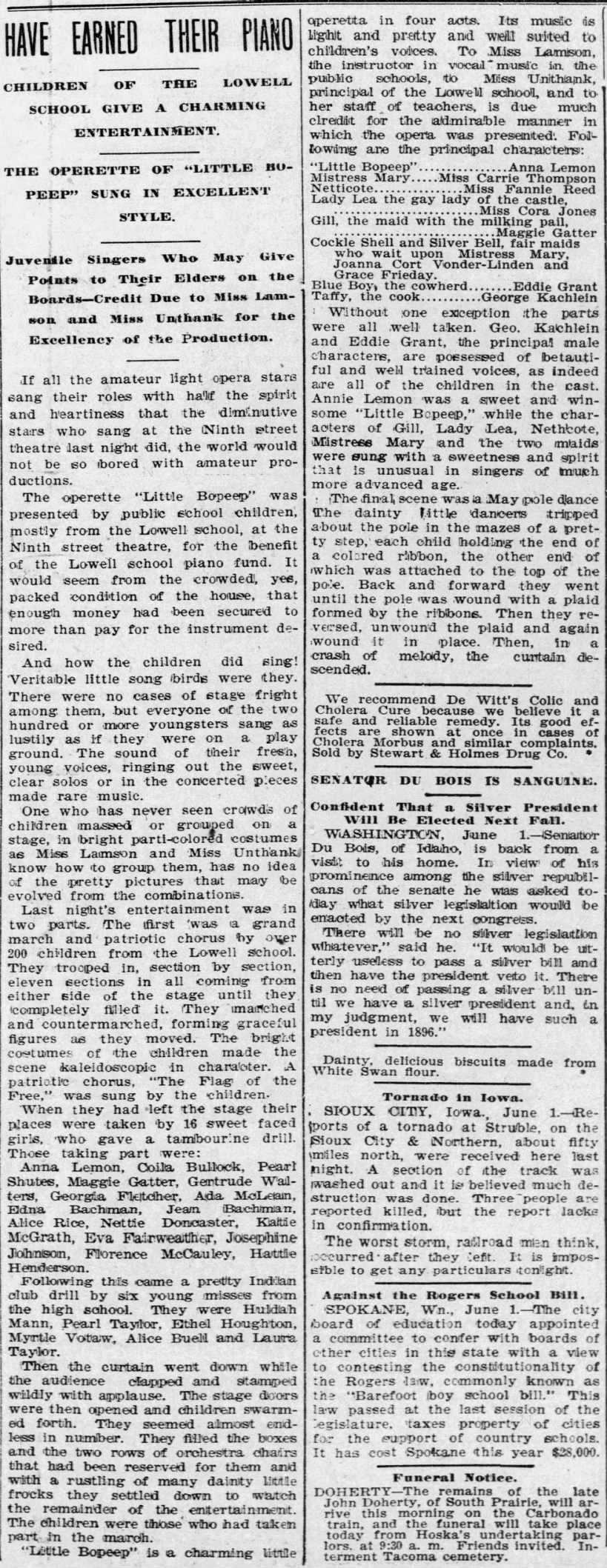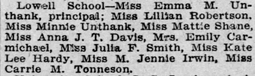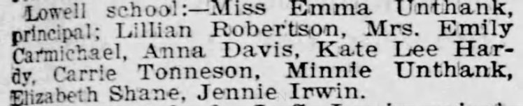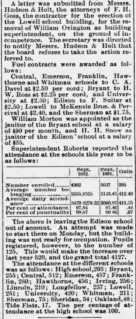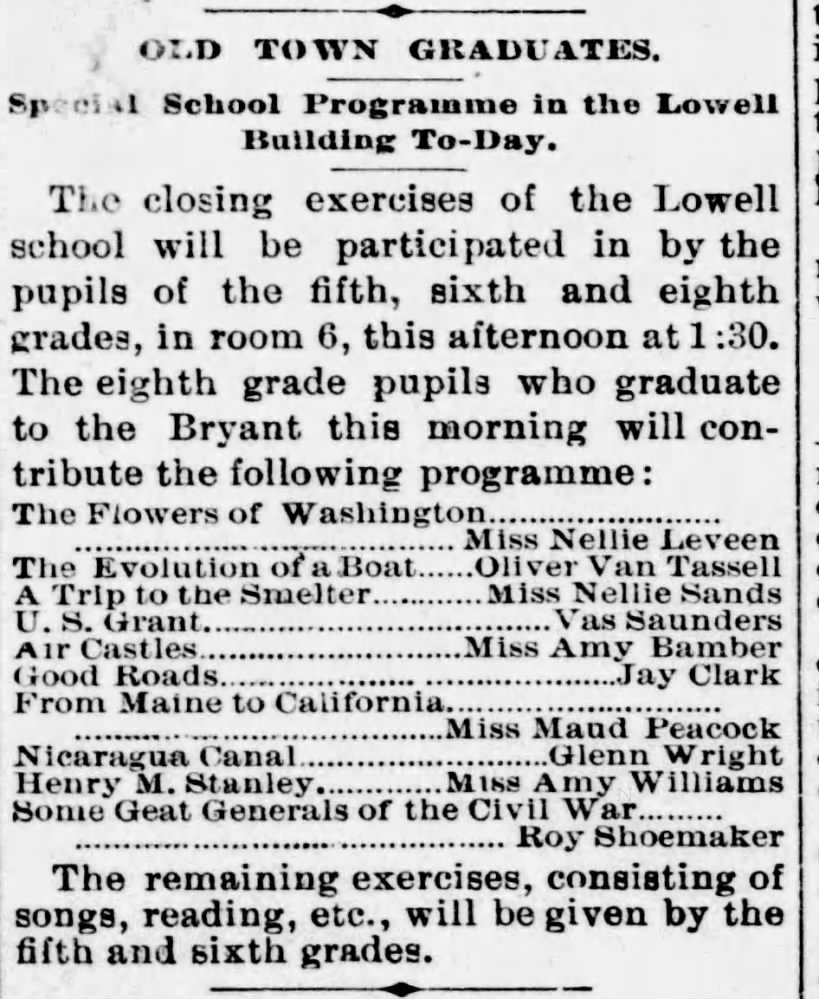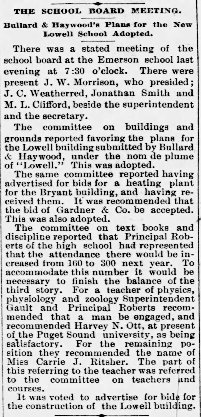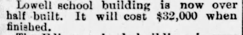 The school board meets to discuss plans for new buildings and building improvements. For Lowell, they decide that “a large building [is] needed here in the future.” In the meantime, they gave Lowell a $2000 budget for the 1891-2 school year, for things like “closets, water, sewer, etc.”