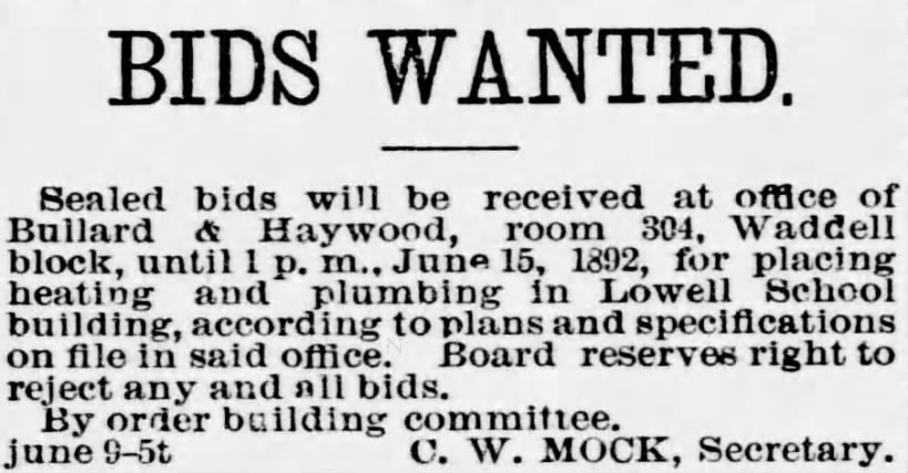 An advertisement is placed, looking for bids for heating and plumbing for the new Lowell school building.