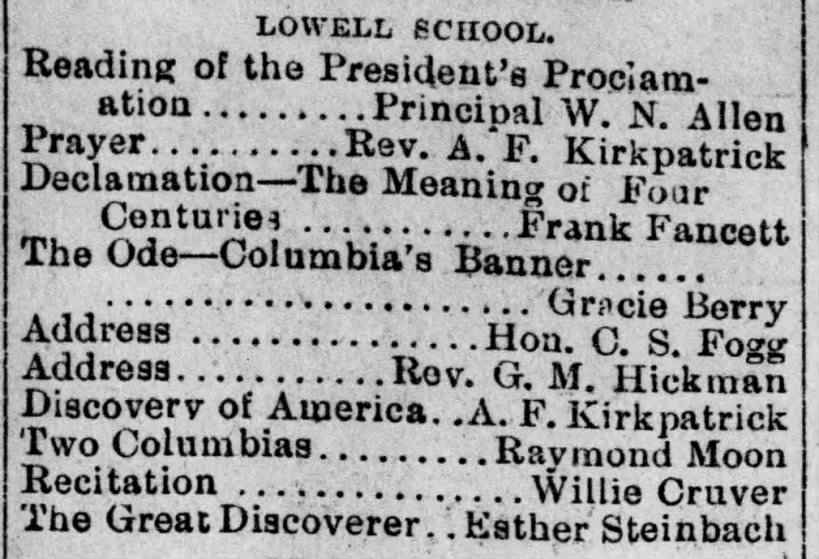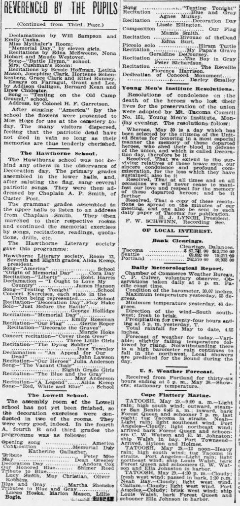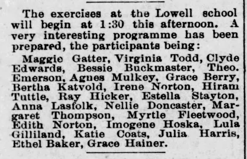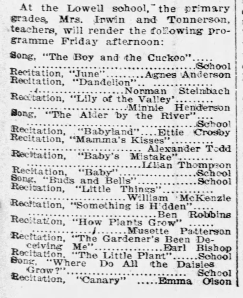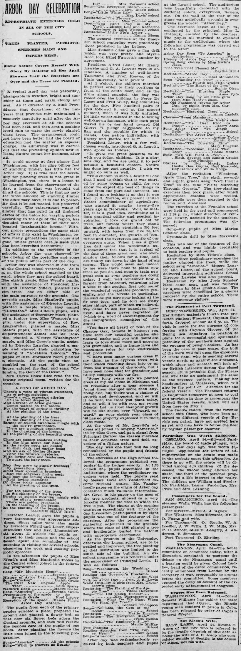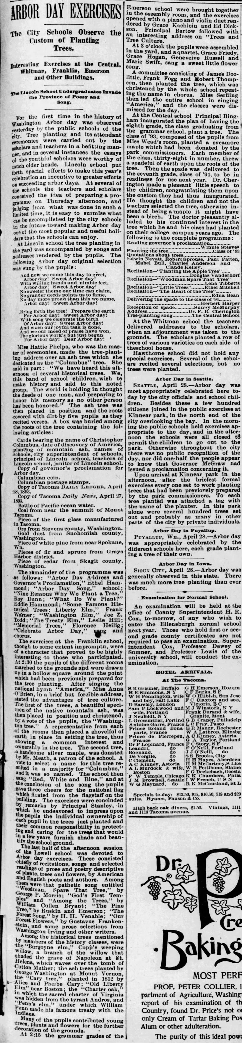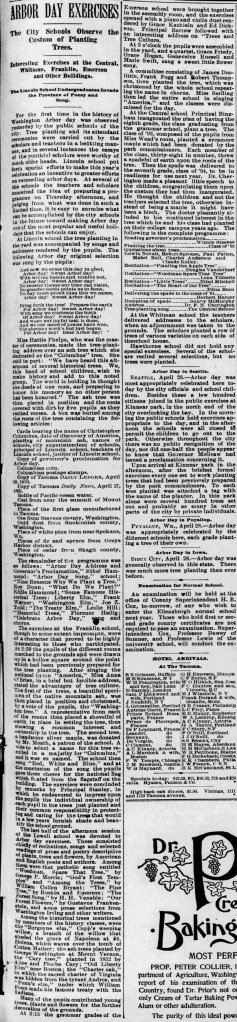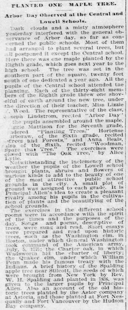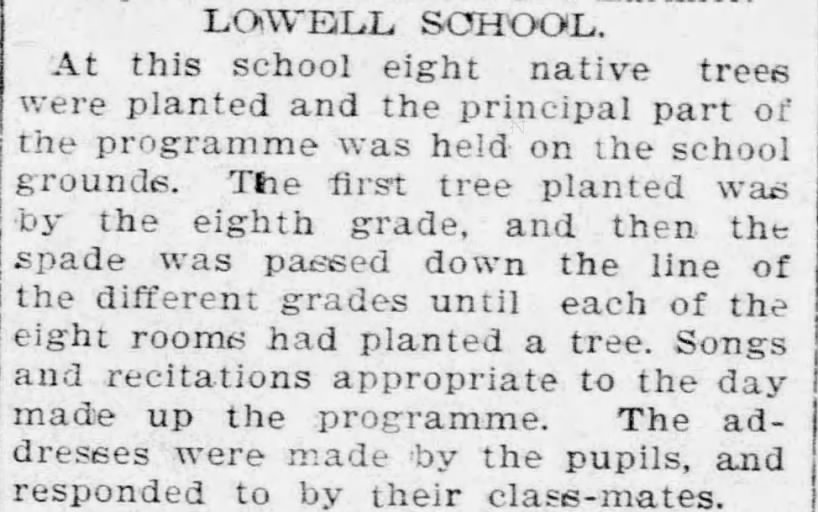 “Arbor Day was enthusiastically received by both teachers and pupils at the Lowell school. The auditorium was beautifully decorated with the national colors, evergreens, flowers, etc. On the wall at the rear of the stage was artistically wrought in evergreens the words: ‘Arbor Day.’