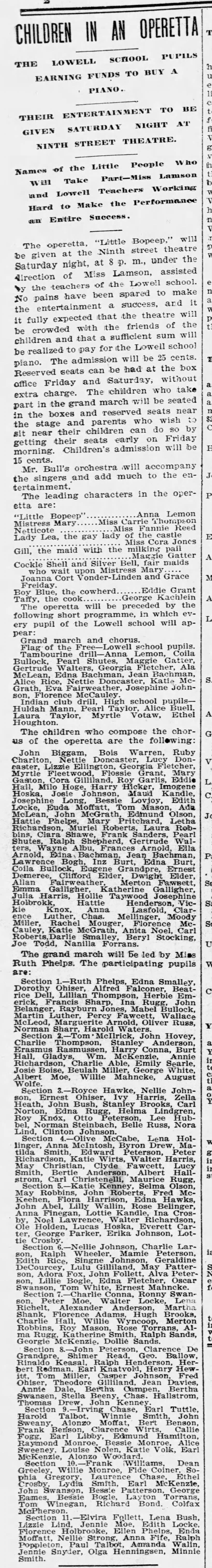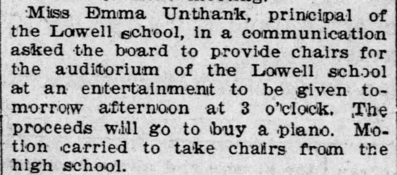 In this clipping, she has requested chairs for the auditorium in order to put on an event in support of the school’s efforts to purchase a piano.