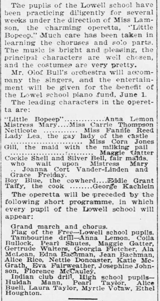 “Notwithstanding the inclemency of the weather the pupils of the Lowell school brought plants, shrubs and flowers of various kinds to add to the beauty of one of the most attractive public school grounds in the city. A small plot of ground was assigned to each grade. It is Principal Allen’s idea to create a pleasant rivalry among his pupils in the cultivation of plants and the beautifying of the school grounds.”