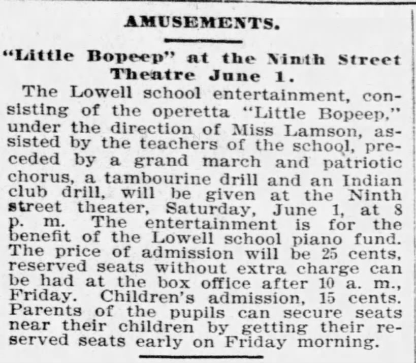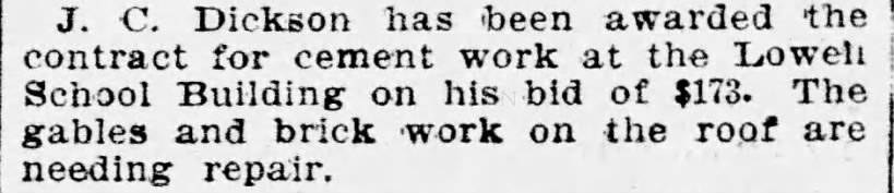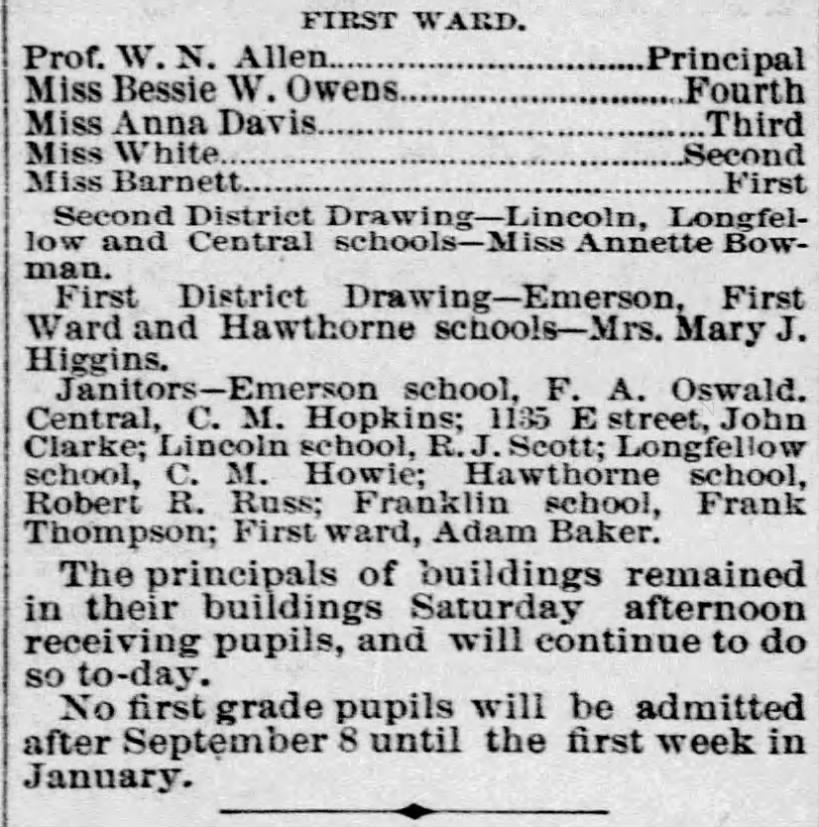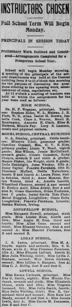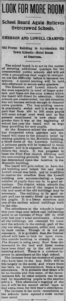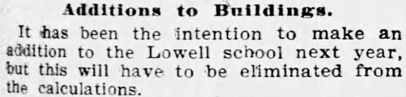 “The board will give orders to have the old building used before the new brick Lowell school was built, put in condition to receive the overflow from the Lowell building now accommodating a larger number of pupils than can be to good advantage. The district which attends the Lowell school is one of the largest in the city and most of the old buildings may be necessary. The building is in good repair and can be easily fitted up to receive the pupils. It is a frame structure and one of the earliest school buildings built in the city.”