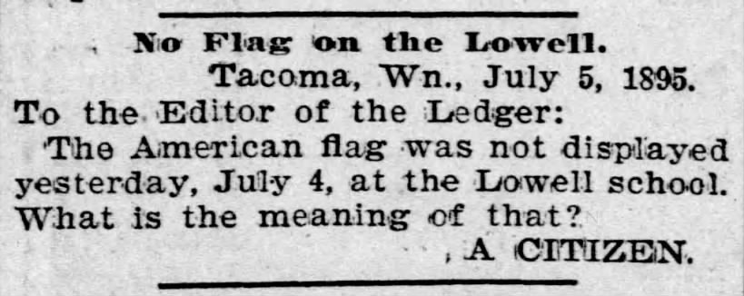 A letter writer to the Tacoma Daily Ledger wonders why the flag at Lowell was not flown on the 4th of July.
