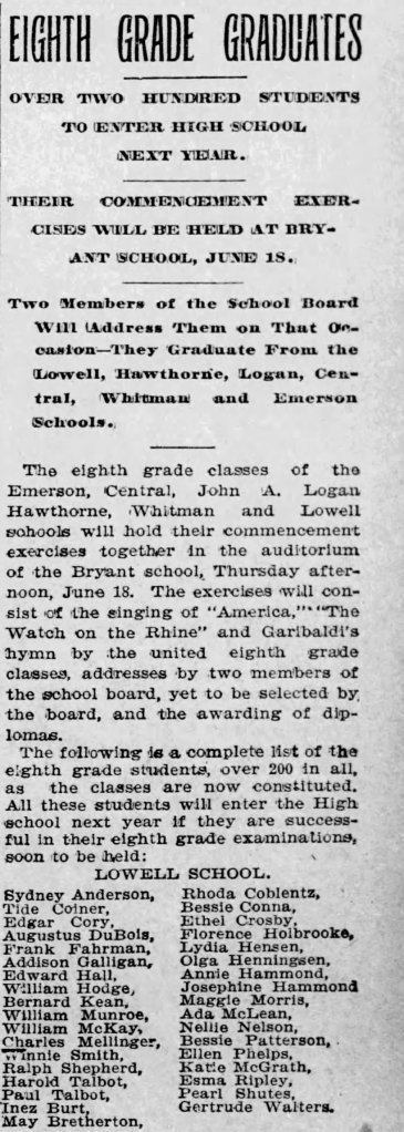 Eighth-grade commencement ceremonies for students from Lowell, Hawthorne, Logan, Central, Whitman, and Emerson schools are held at Bryant school. Over two-hundred students move on to high school.