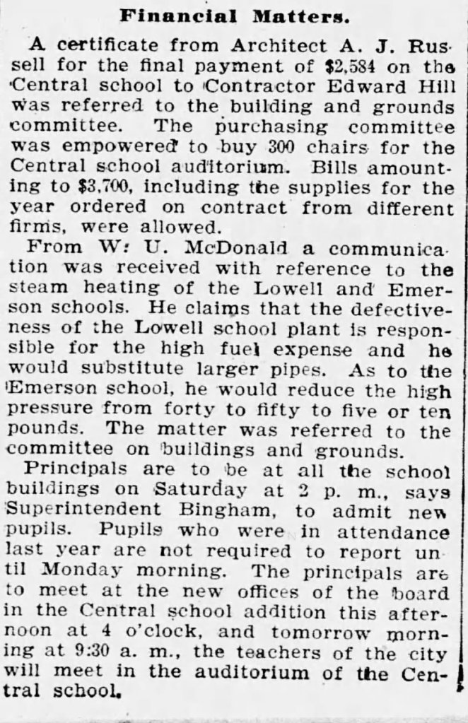 The completion of the Lowell would make it one of the finest buildings in the city and the additional room there could be taken advantage of to relieve the Emerson, if necessary. It is hard to tell what would be best to do at once, but it strikes me that now is a good time to make these additions to the school accommodations and saving the expense of renting rooms which are at best but ill suited for occupation by children through the wet and cold weather. It is only a question of whether the district can stand the expense.”