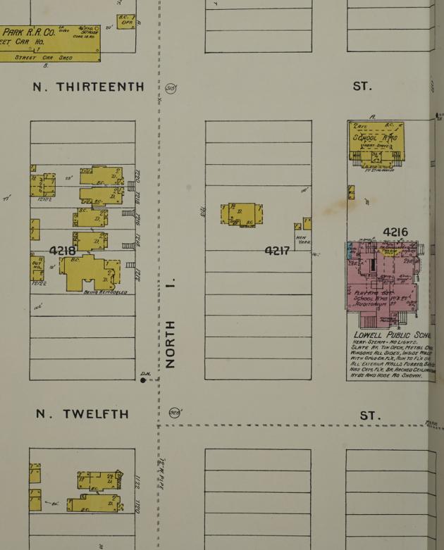 This map, from the Sanborn Fire Insurance map collection, shows the layout of the school grounds, with the new building in the center of the lot on Yakima between N. 12th and 13th streets. The old building (the annex) is on the corner of the lot, on 13th street.