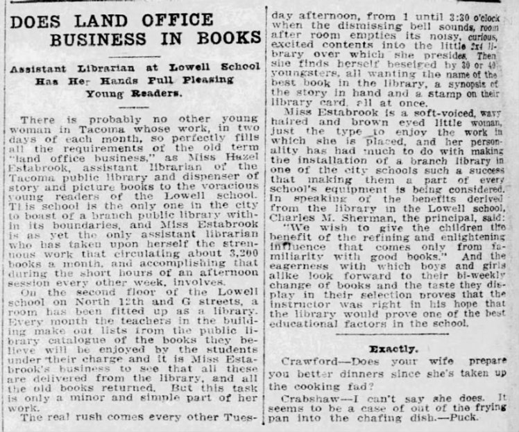 An article about Miss Hazel Estabrook, an assistant librarian at Lowell who helps the children find books to read.