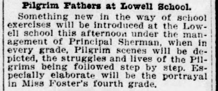 Pilgrim scenes will be depicted in Thanksgiving exercises at the school, under the management and direction of Principal Sherman.