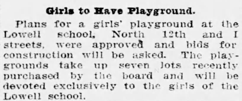 Plans for a girls’ playground are made after the school district goes through with the purchase of seven lots across the alley at Lowell, in addition to the two they had bought in November of the previous year.
