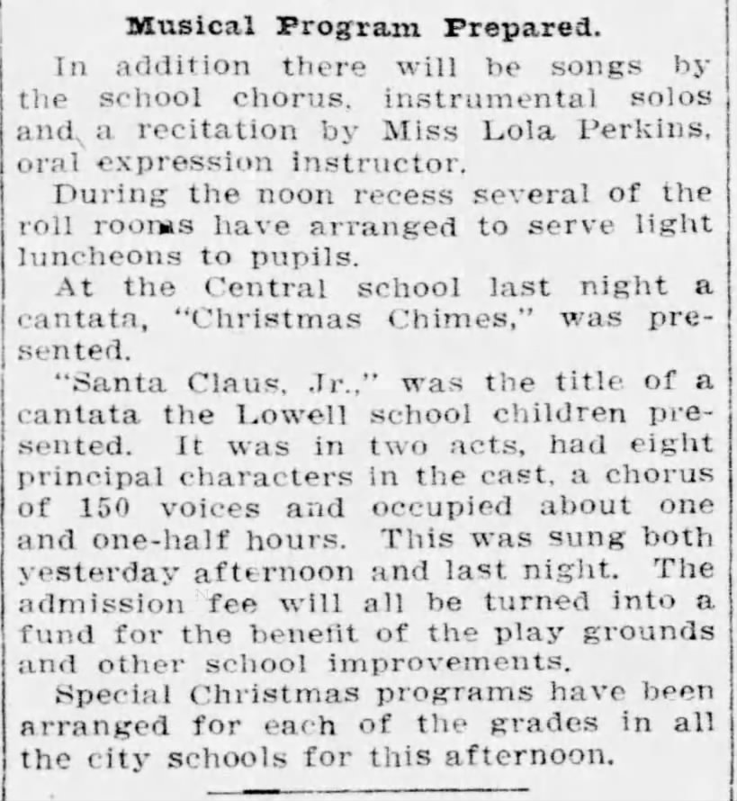 Lowell students present a cantata titled “Santa Claus, Jr” in a musical Christmas program.