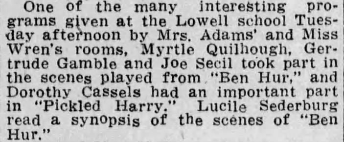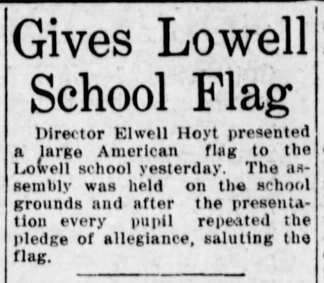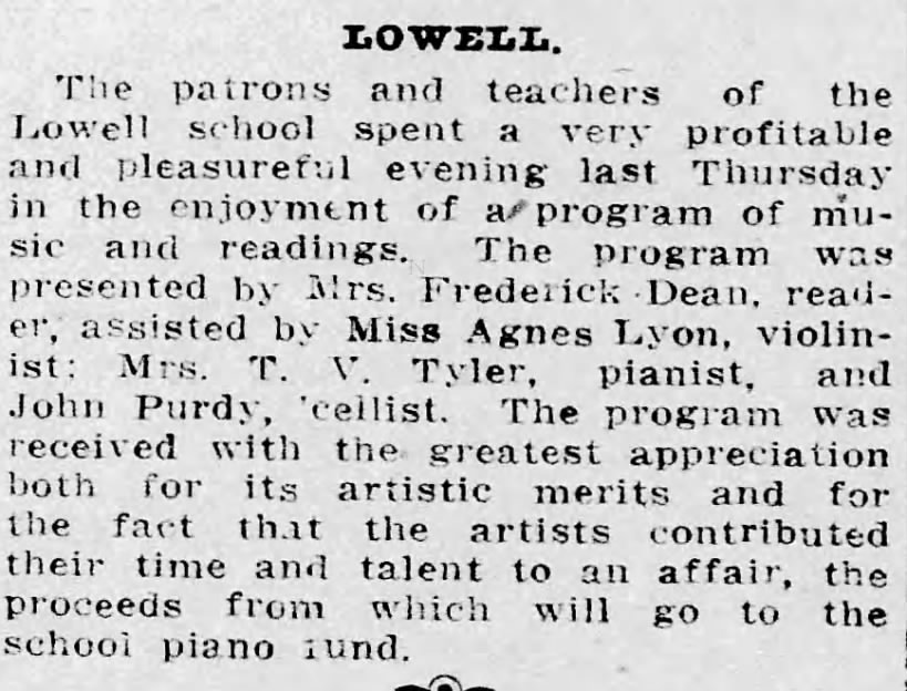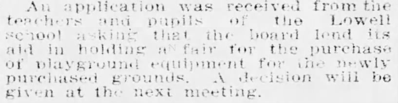 An application was received from the teachers and pupils of the Lowell school asking that the board lend its aid in holding a fair for the purchase of playground equipment for the newly purchased grounds. A decision will be given at the next meeting.