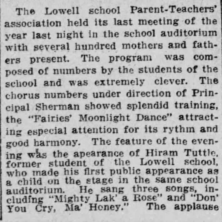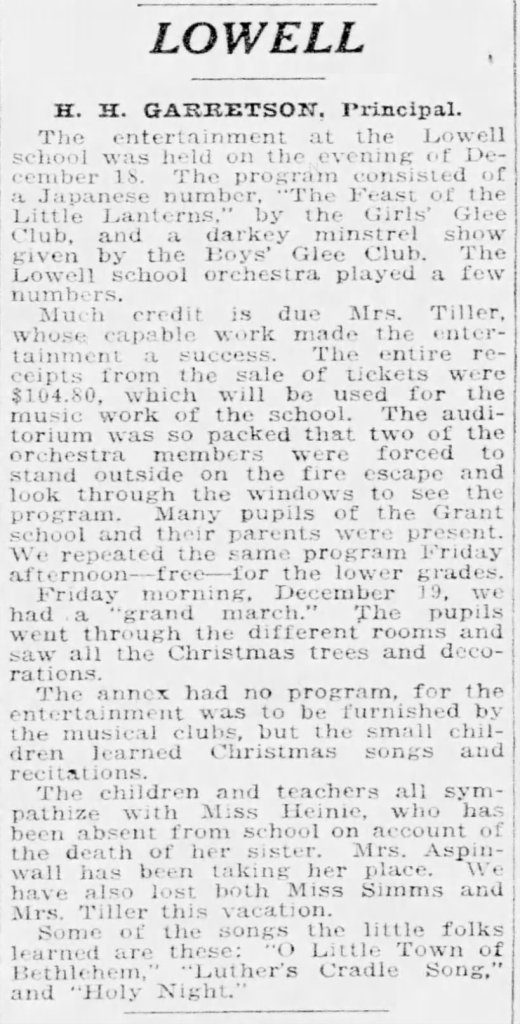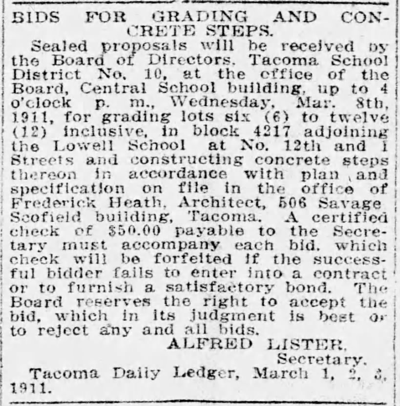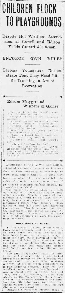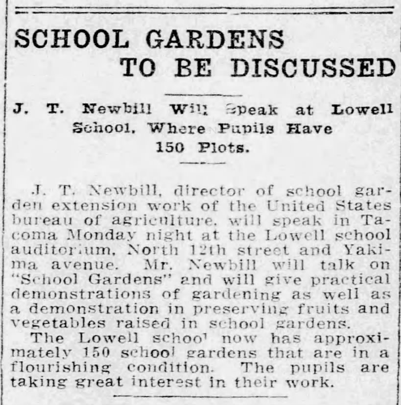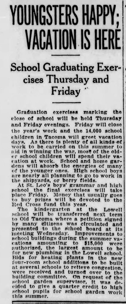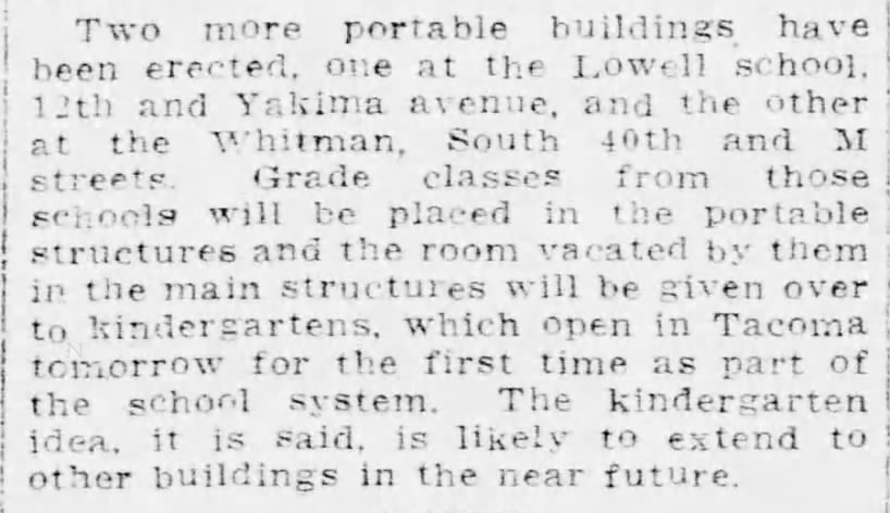 The school year ends, and plans are announced to move Lowell’s kindergarten from Lowell to Old Tacoma.