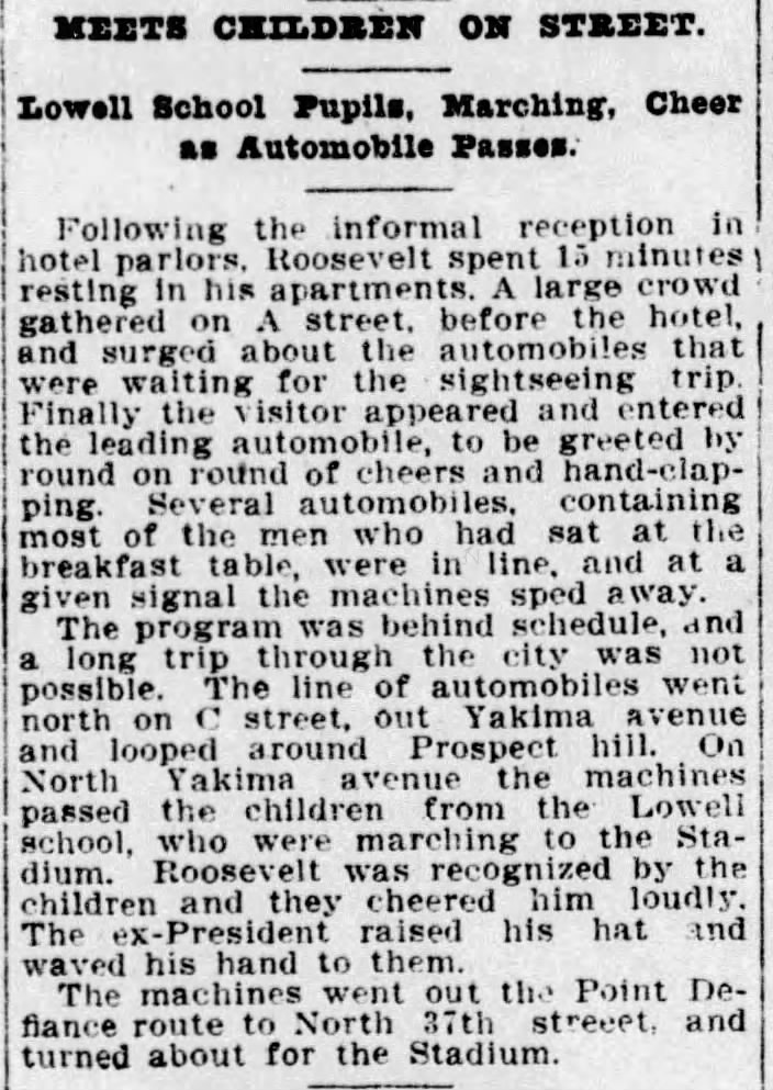 “On North Yakima avenue the machines [cars] passed the children from the Lowell school, who were marching to the Stadium. Roosevelt was recognized by the children and they cheered him loudly. The ex-president raised his hat and waved his hand to them.”