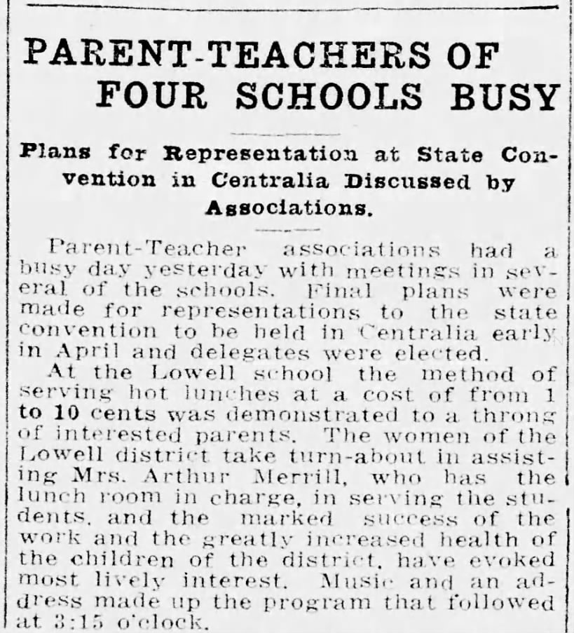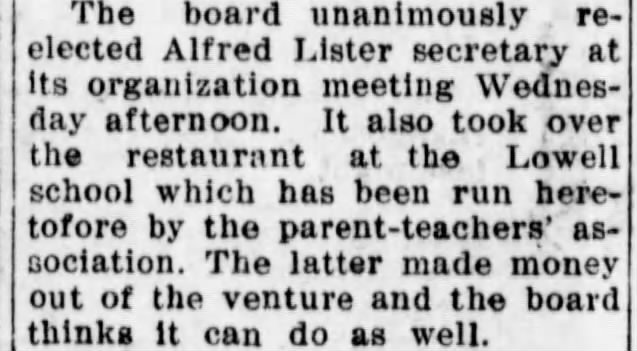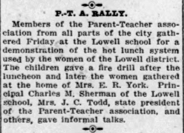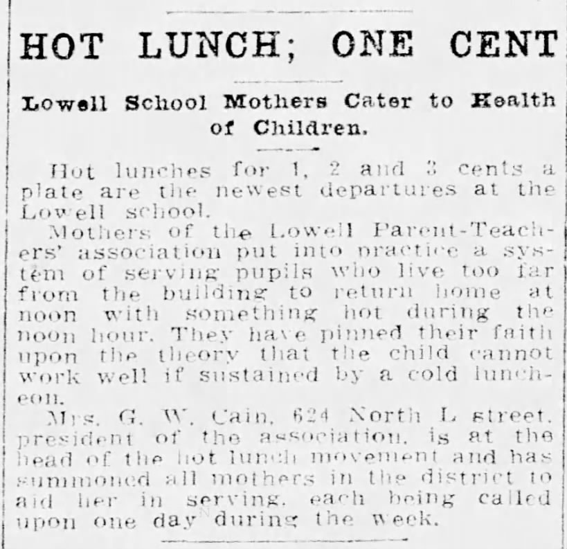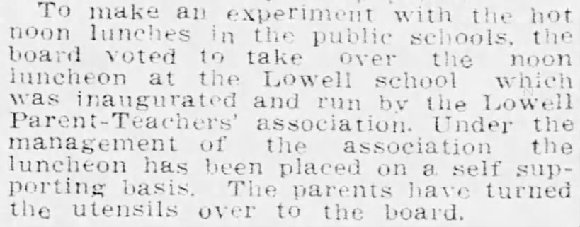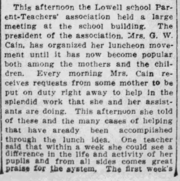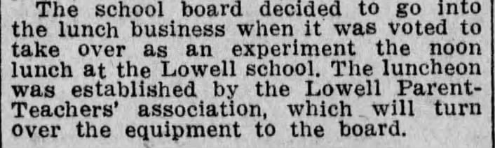 The mothers of the Lowell PTA, led by president Mrs. G. W. Cain, begin the hot lunch program that continues to this day. It is implemented to aid the “many boys and girls who live either too far away or whose health will not allow them to go home for lunch.”
