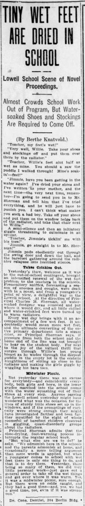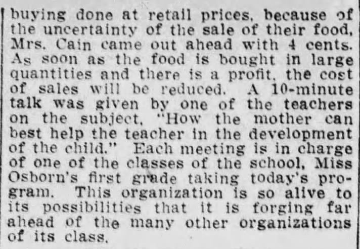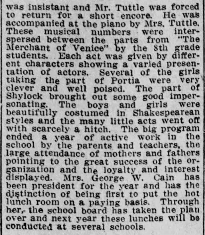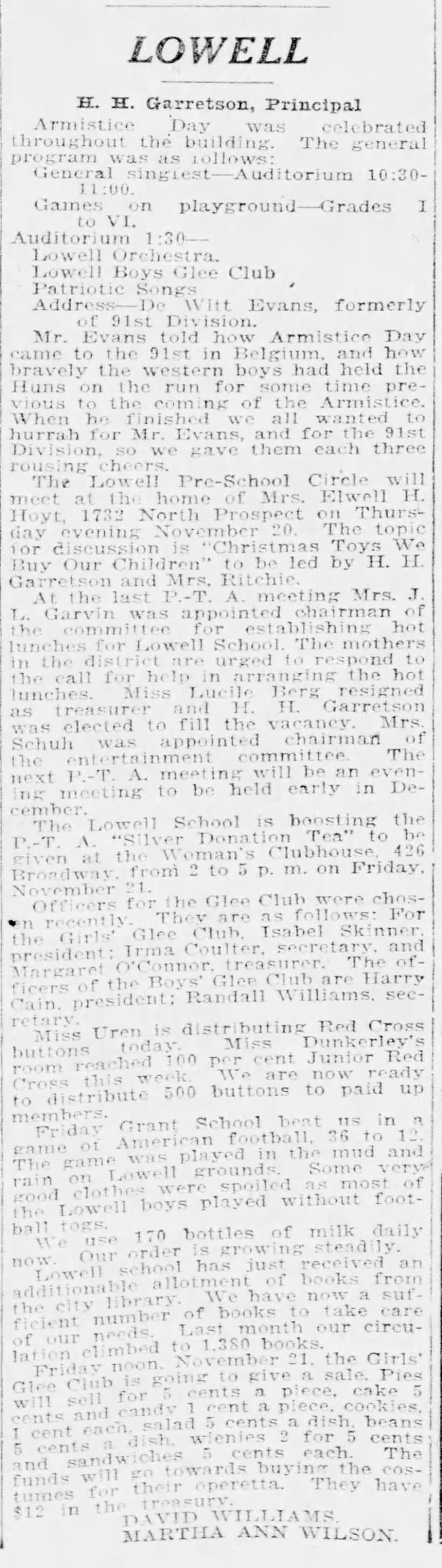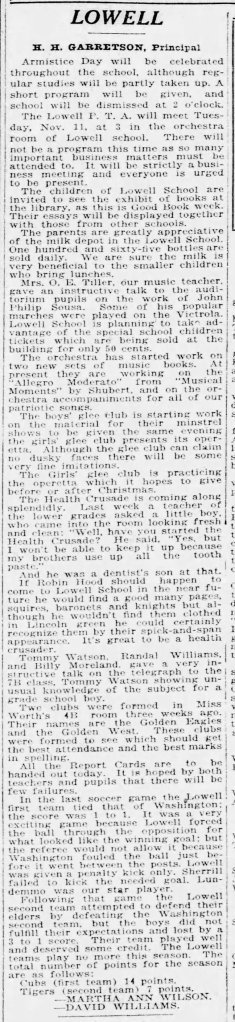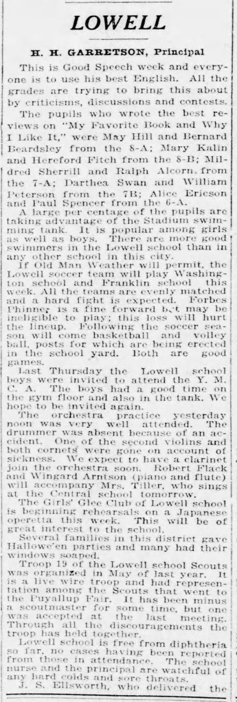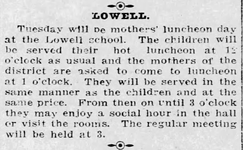The mothers of the Lowell PTA, led by president Mrs. G. W. Cain, begin the hot lunch program that continues to this day. It is implemented to aid the “many boys and girls who live either too far away or whose health will not allow them to go home for lunch.”