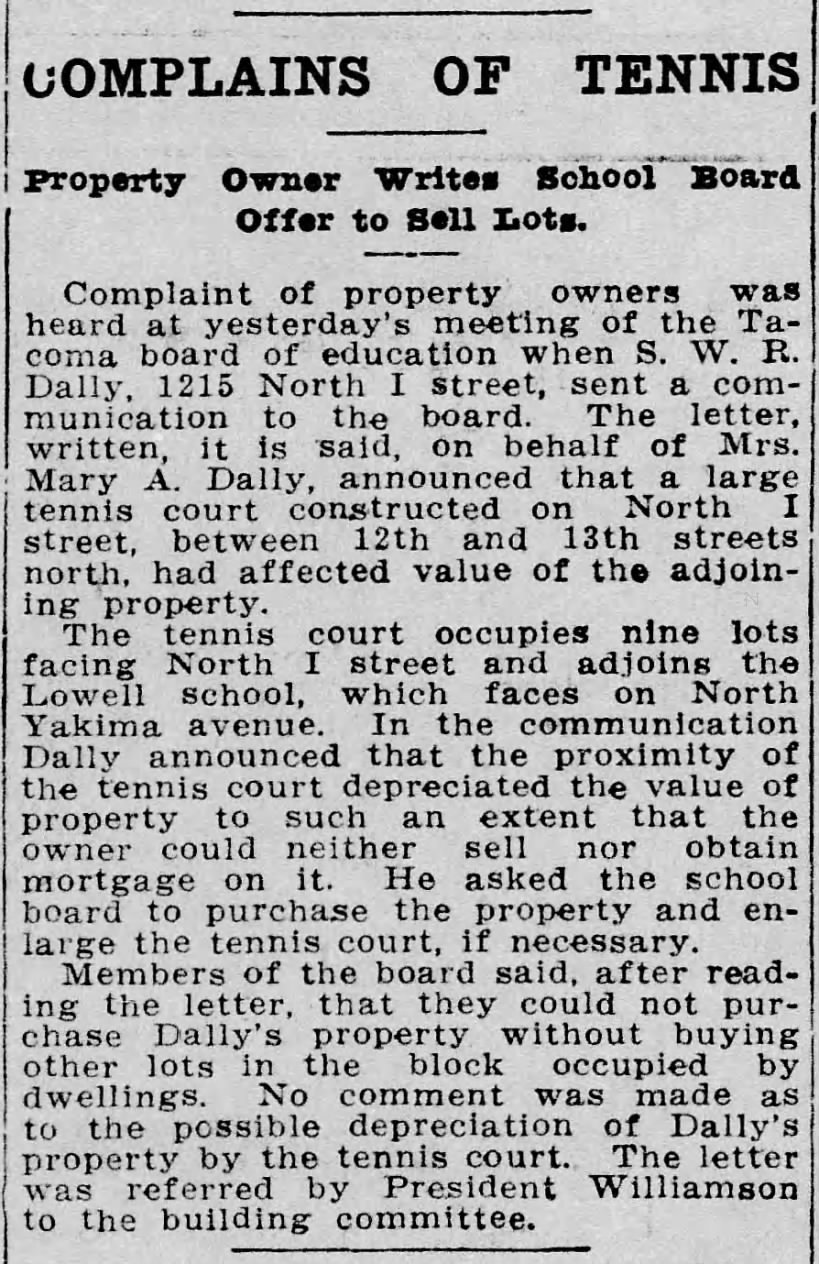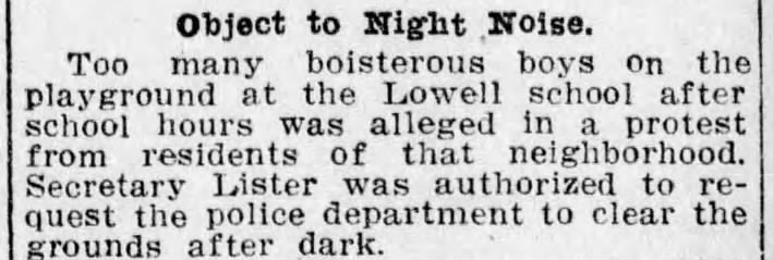 A neighbor with a lot adjoining the playground area complains about Lowell’s tennis court decreasing the value of their property to the extent that the owner could not sell it or get a mortgage on it. The neighbor offered to let the school board purchase the property, but the school board declined, with the reasoning that they would then have to also purchase the remaining lots on the block, currently occupied by houses.