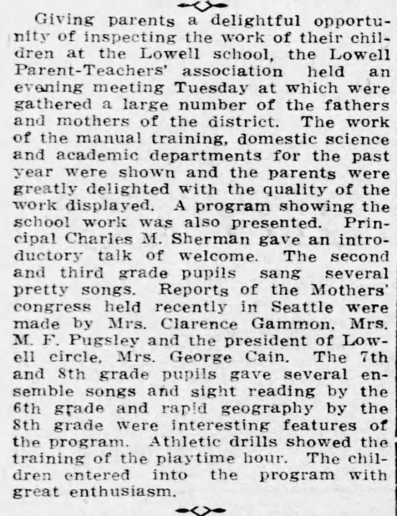 The program was replete with tributes to the character of Mr. Stewart, the first teacher, and two of his sons, William A. Stewart, chief deputy in the county auditor’s office, and Fred Stewart of Puyallup, were present and were introduced to the assemblage. The little church was filled to its doors and crowds stood in the vestibule and doorway. Many pupils of the Lowell school, the present-day evolution of the first school, attended with their principal, Charles M. Sherman.