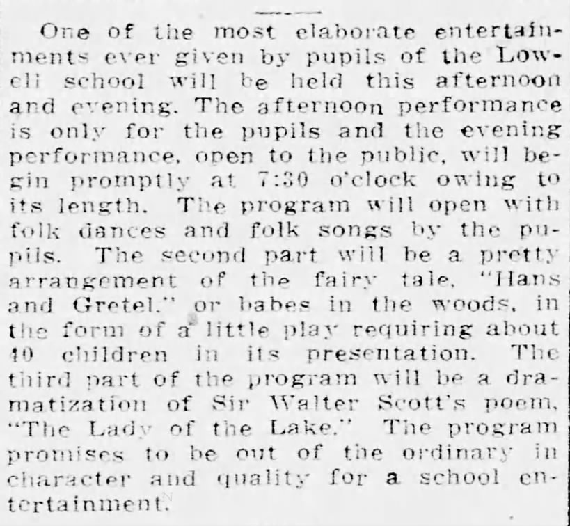 Lowell students give performances of “Hansel and Gretel” and “The Lady of the Lake,” as well as dance and musical performances.