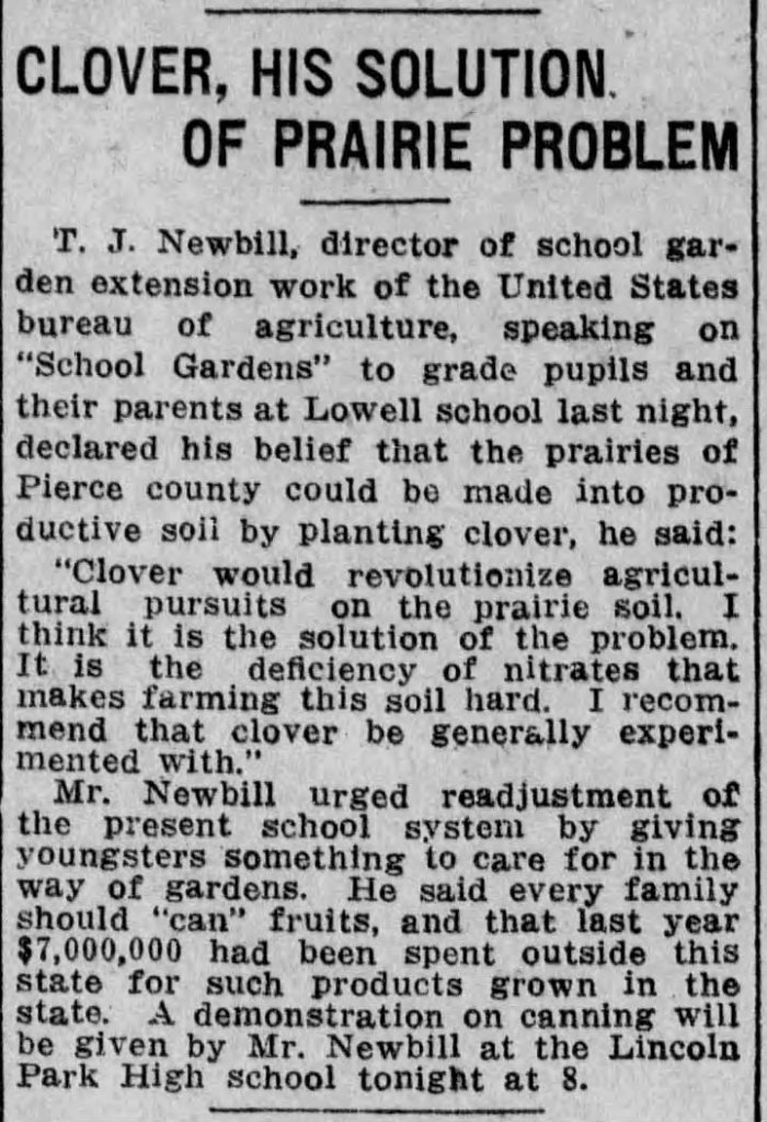 T. J. Newbill gave a talk to Lowell parents and students about the importance of school gardens. He also champions the idea of planting clover in the Pierce county prairies, which he said would help to make them productive.