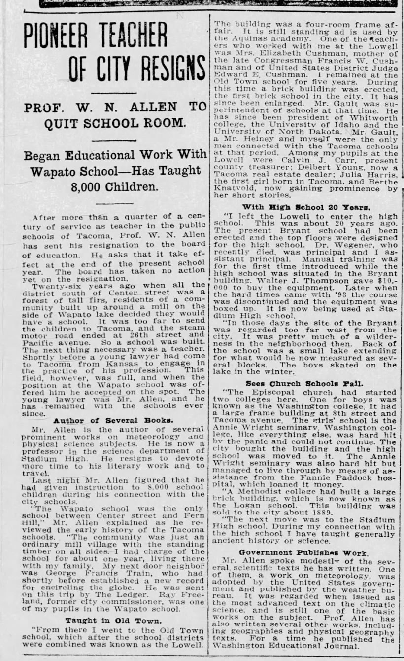 Mrs. C. E. Hill, one of the first pupils of the second school, which was opened in 1876, took up the school’s history and told of its growth from a room in the Hansen-Ackerson mill, taught by Mrs. Ackerson and Miss H. Wolfe, to the first building at 20th and Starr streets, near the site of the present Lowell school. Mrs. Clara Wilt, one of the teachers in that building, added another chapter, telling of the consolidation of the schools of Old Tacoma and New Tacoma in 1890, and of their growth. William F. Geiger, superintendent of Tacoma schools, brought the progress up to date with some comparisons of the school system of today.