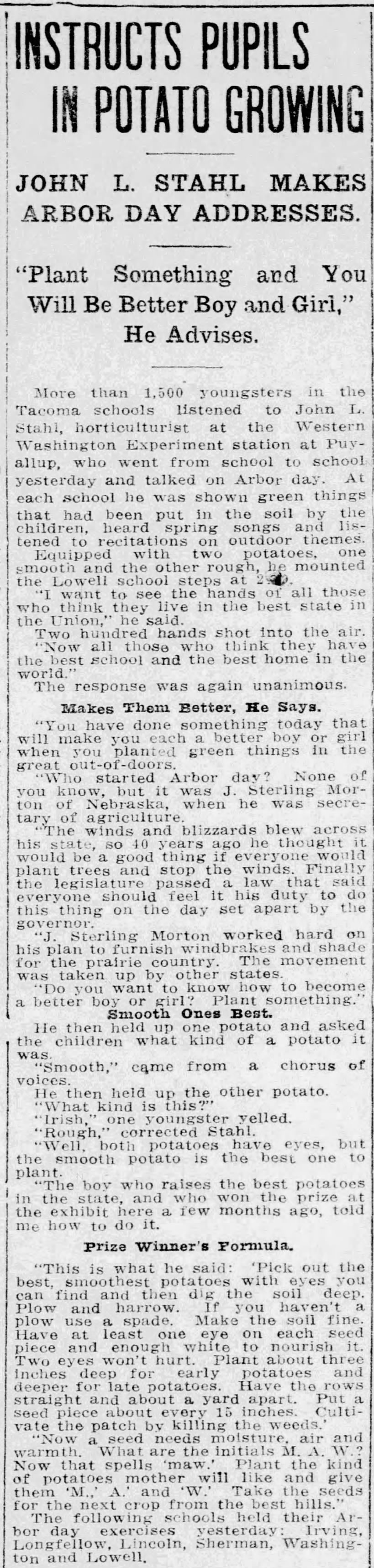 W. P. Bonney, secretary of the State Historical Society, gave a brief historical sketch of Mr. Stewart, the teacher. He said Mr. Stewart came to Steilacoom in 1859, soon after taking a claim on the Puyallup river, and first teaching school in the winter near Spanaway. In 1869 Mr. Stewart became bookkeeper for the Hansen-Askerson mill at Old Tacoma and his desire to again take up teaching led to his acceptance as teacher of the first school, which had 12 pupils.