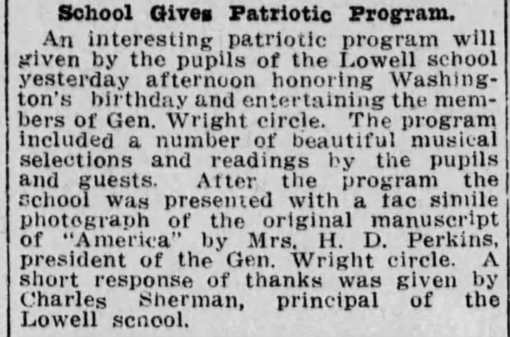 J. P. Stewart, the first teacher at what would become Lowell school (and therefore the first teacher in Tacoma) was honored with a bronze plaque. Former students of his from the days when the school was located in a one-room building spoke about their memories.