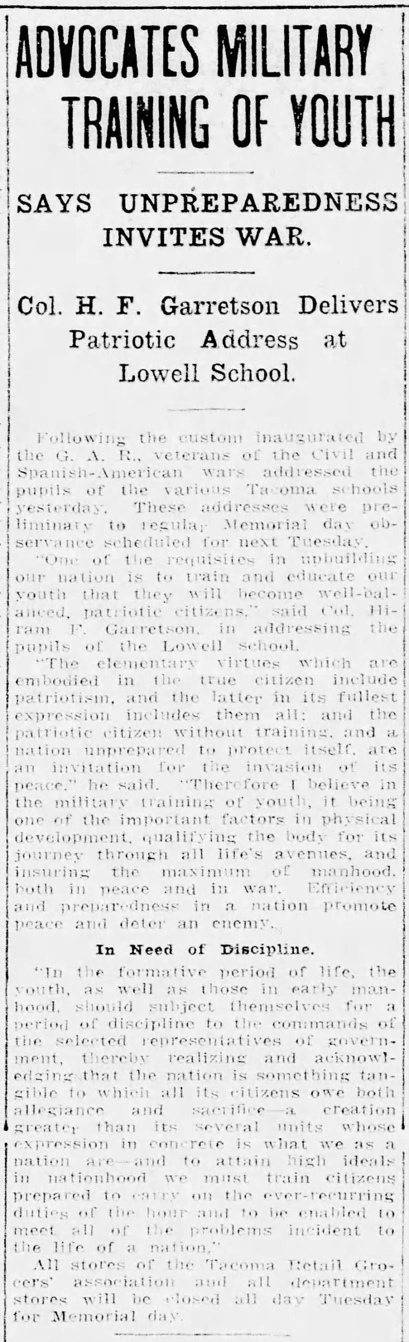 Colonel Hiram F. Garretson addresses Lowell in honor of Memorial Day and advocates for the military training of youth.