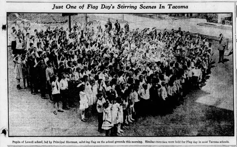 Caption: Pupils of Lowell school, led by Principal Sherman, saluting flag on the school grounds this morning. Similar exercises were held for Flag day in most Tacoma schools.