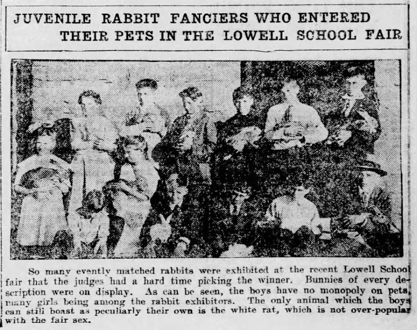 Caption: So many evently [sic] matched rabbits were exhibited at the recent Lowell School fair that the judges had a hard time picking the winner. Bunnies of every description were on display. As can be seen, the boys have no monopoly on pets, many girls being among the rabbit exhibitors. The only animal which the boys can still boast as particularly their own is the white rat, which is not over-popular with the fair sex.