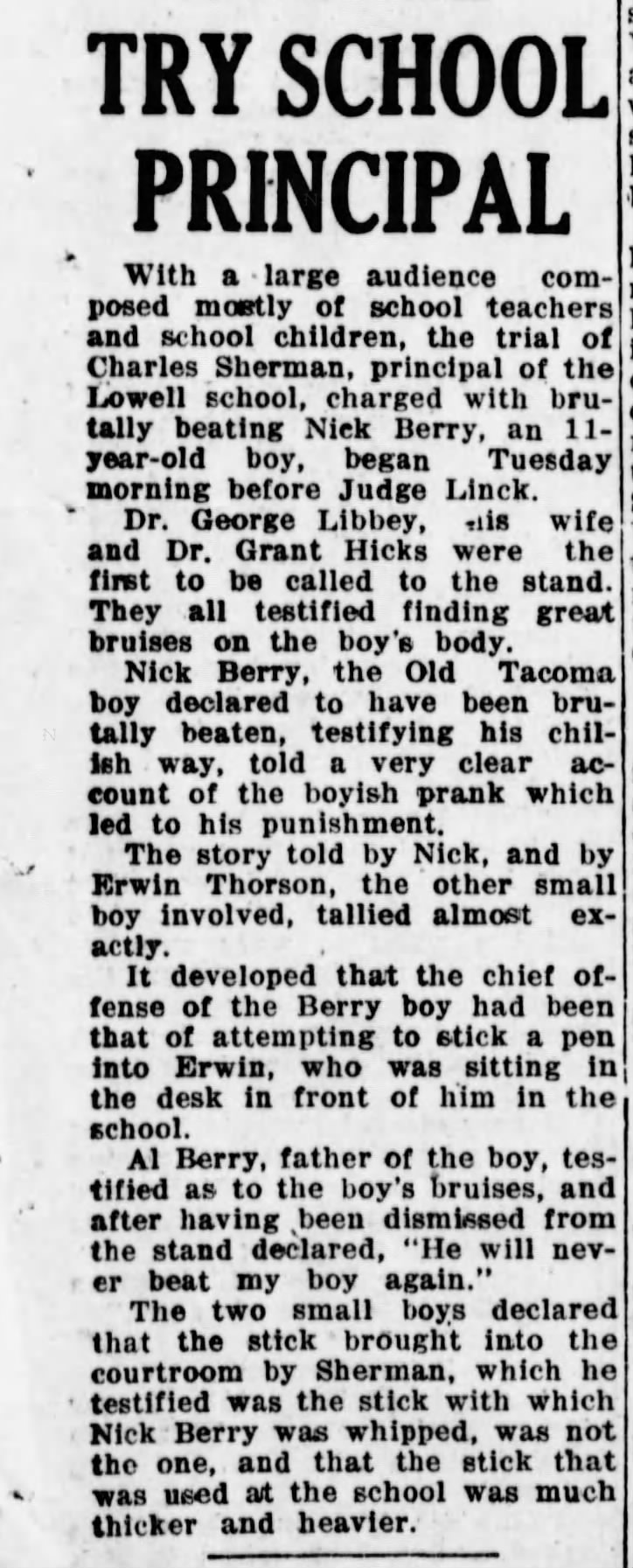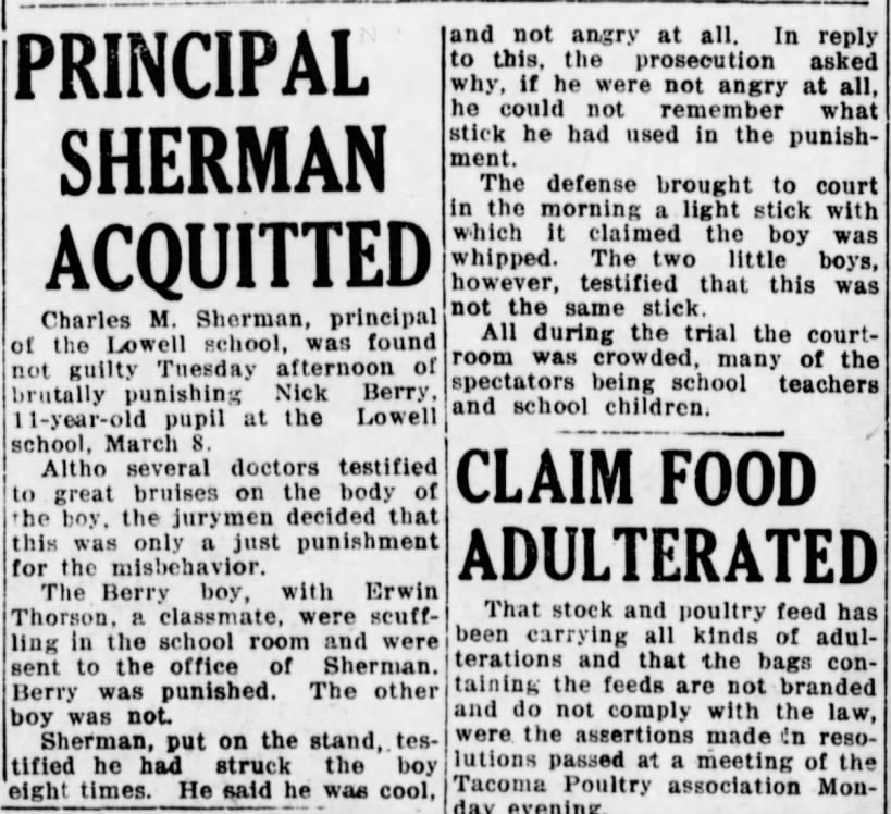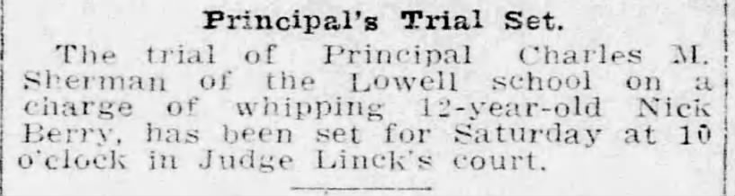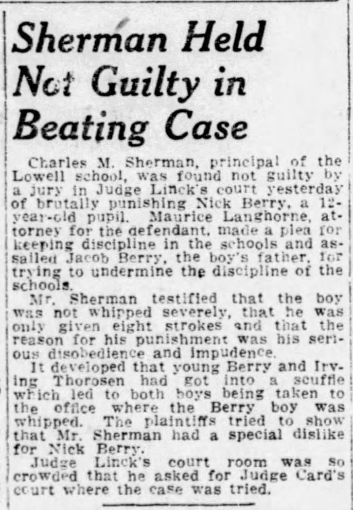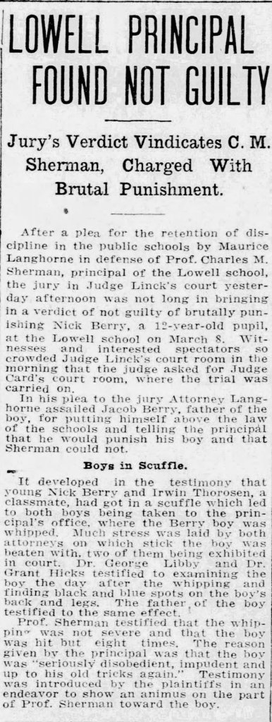 Principal Sherman is found not guilty by the jury, though he does not deny having whipped the boy.