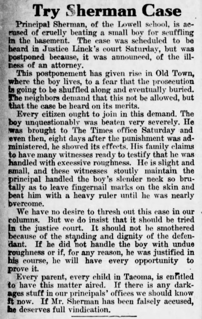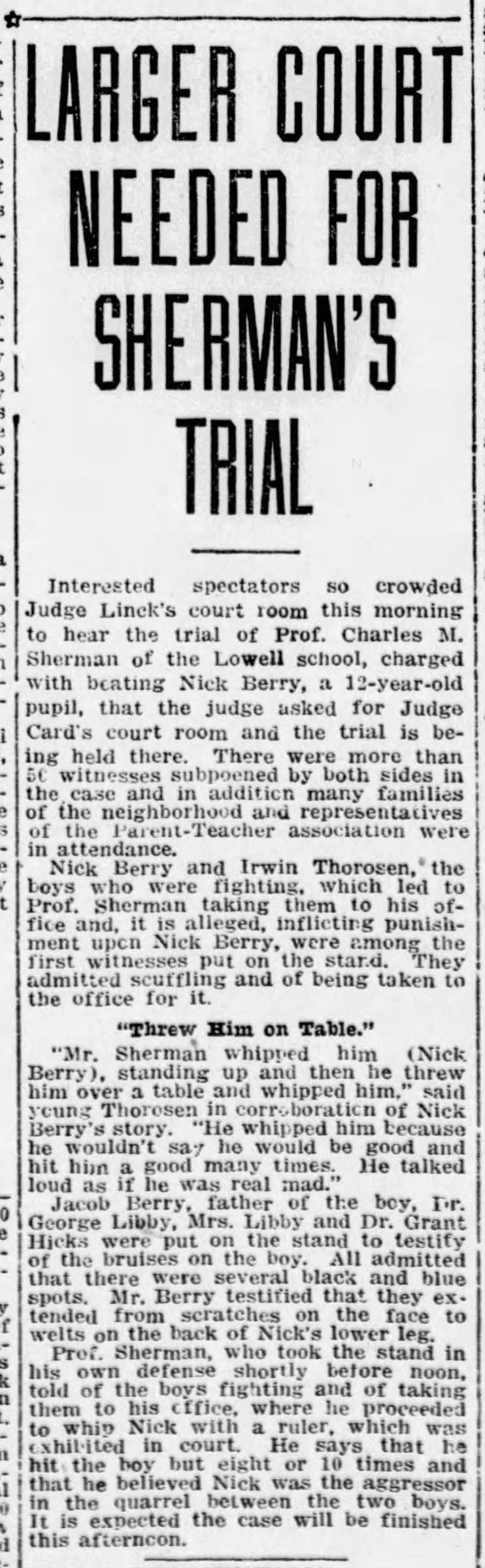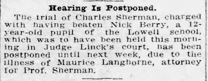 Sherman’s case is further postponed due to the absence of school superintendent W. F. Geiger.