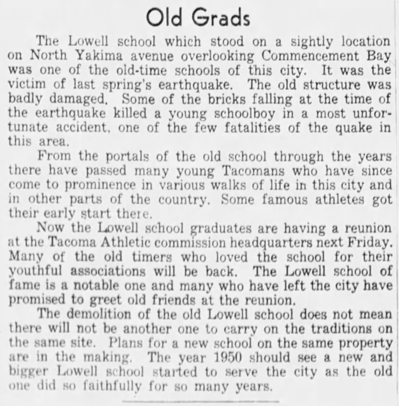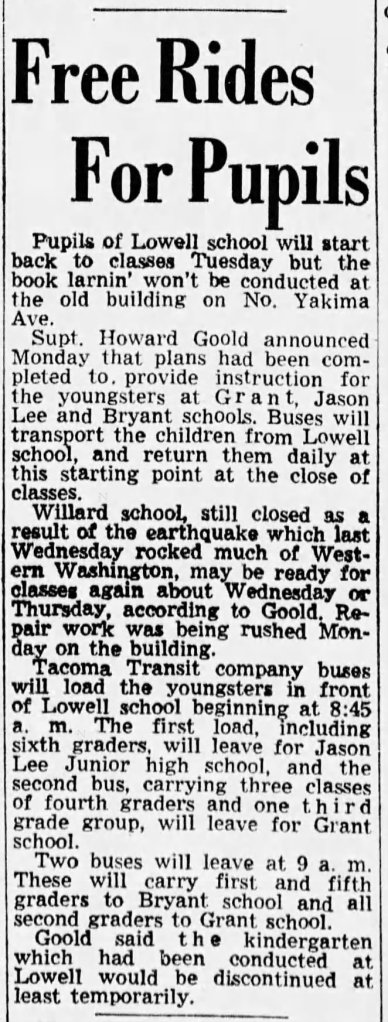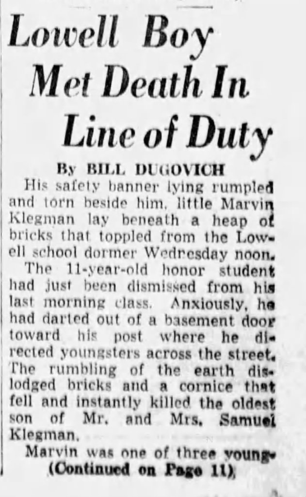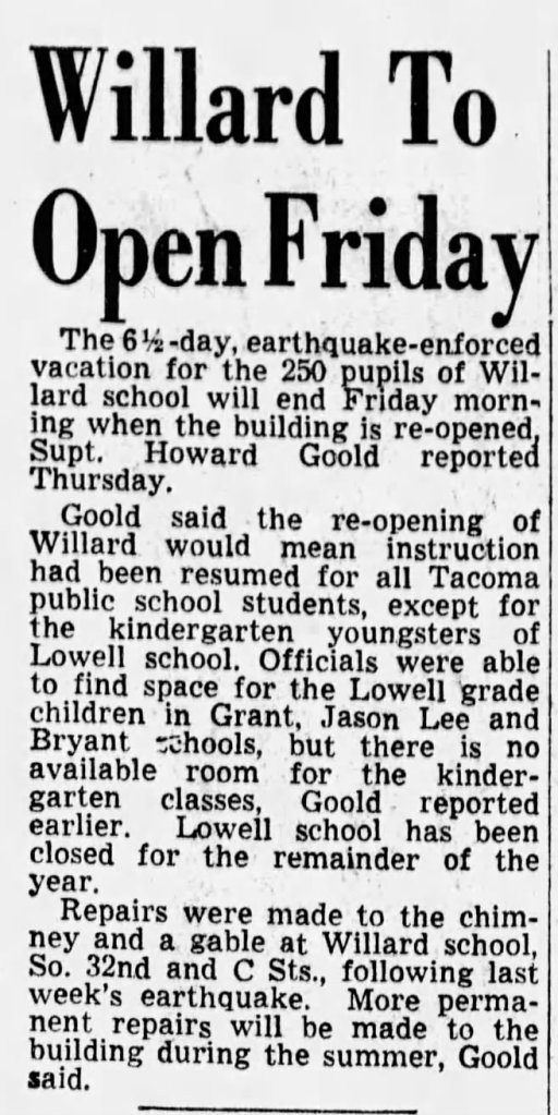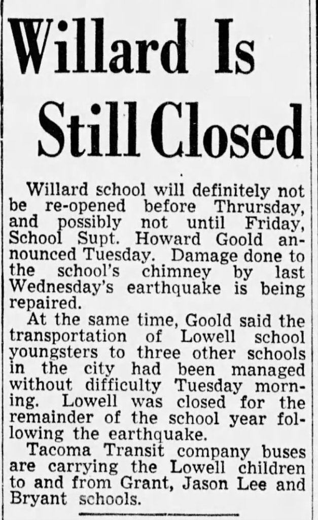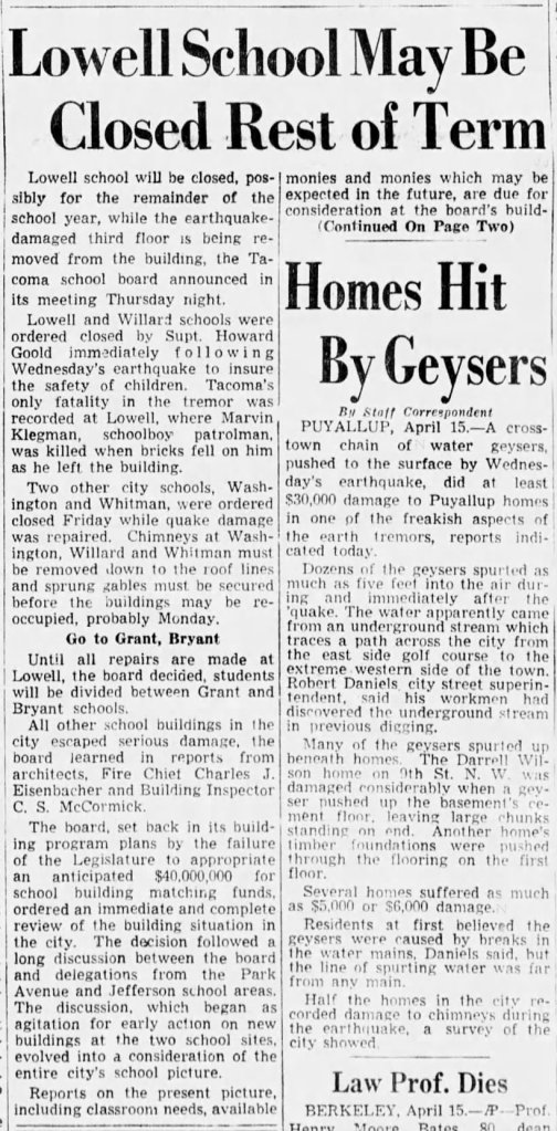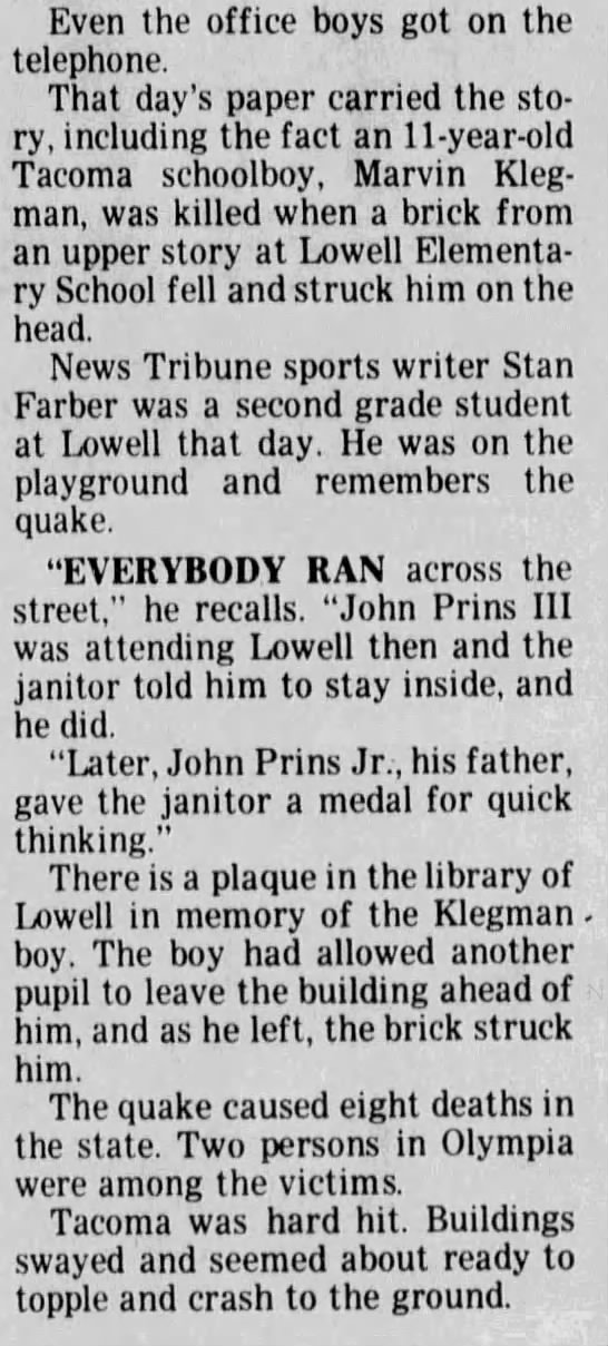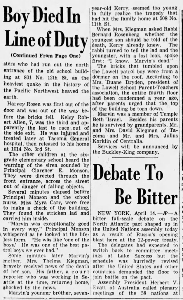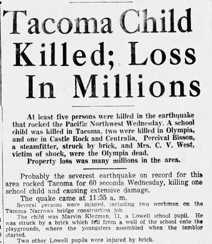 A severe earthquake (some sources give 6.7 as the magnitude, others say 7.1) shook Tacoma. Afterward, 11-year-old student Marvin Klegman, a student safety officer was leading younger kids out of the building when bricks fell from the damaged building above. He pushed a younger boy out of the way, and the brick hit him instead, killing him instantly.