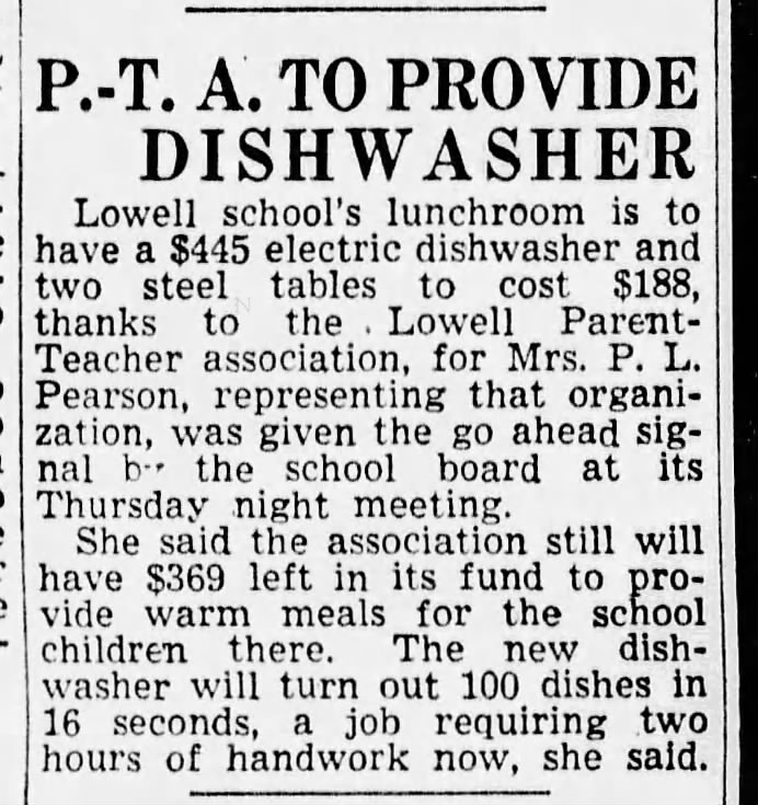 The Lowell PTA will buy an electric dishwasher and two steel tables for the school. This will greatly improve efficiency in the kitchen.