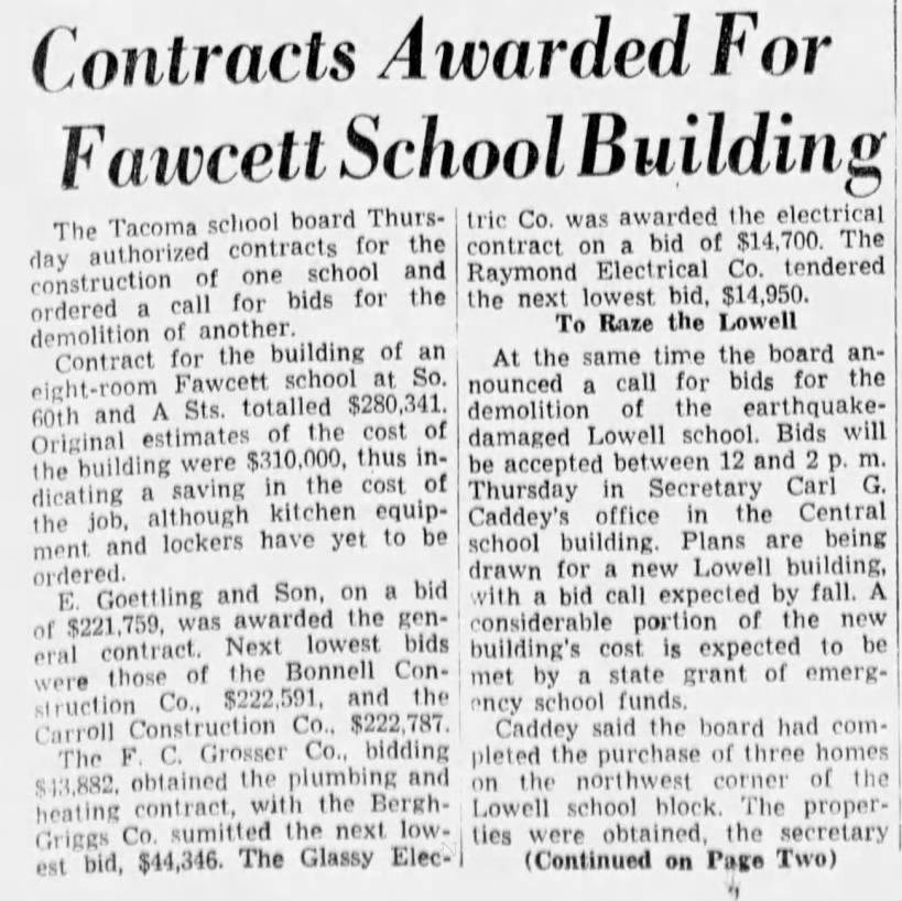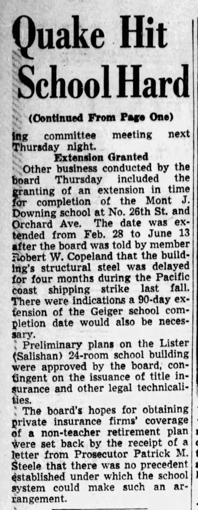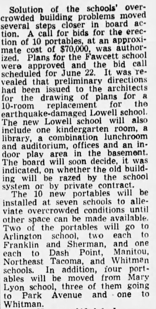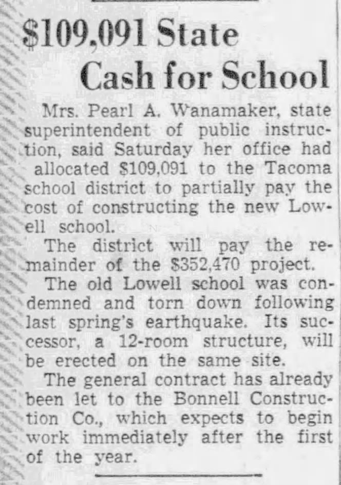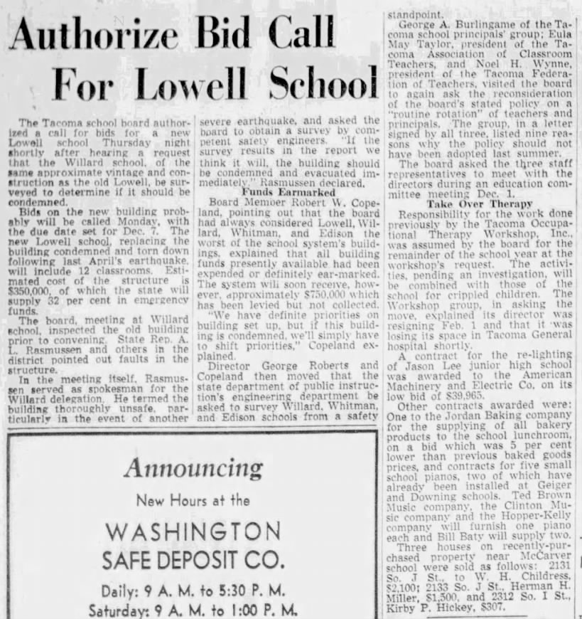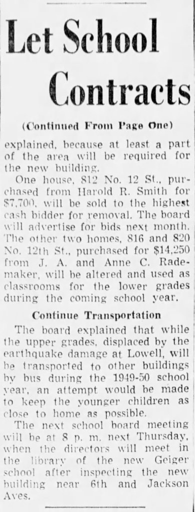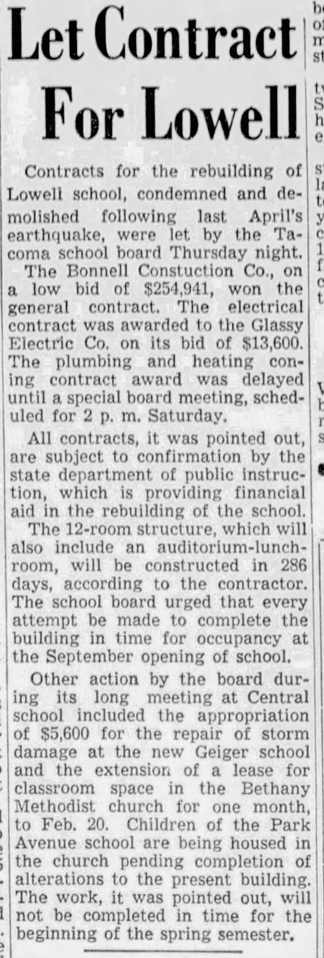 “It was revealed that preliminary directions had been issued to the architects for the drawing of plans for a 10-room replacement for the earthquake-damaged Lowell school. The new Lowell school will also include one kindergarten room, a library, a combination lunchroom and auditorium, offices and an indoor play area in the basement. The board will soon decide, it was indicated, on whether the old building will be razed by the school system or by private contract.”