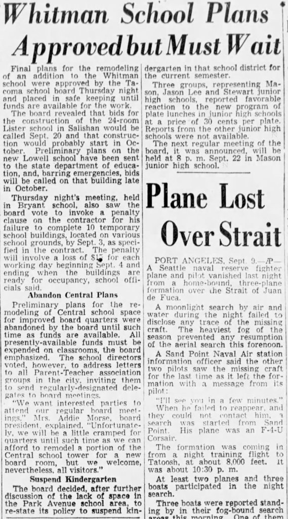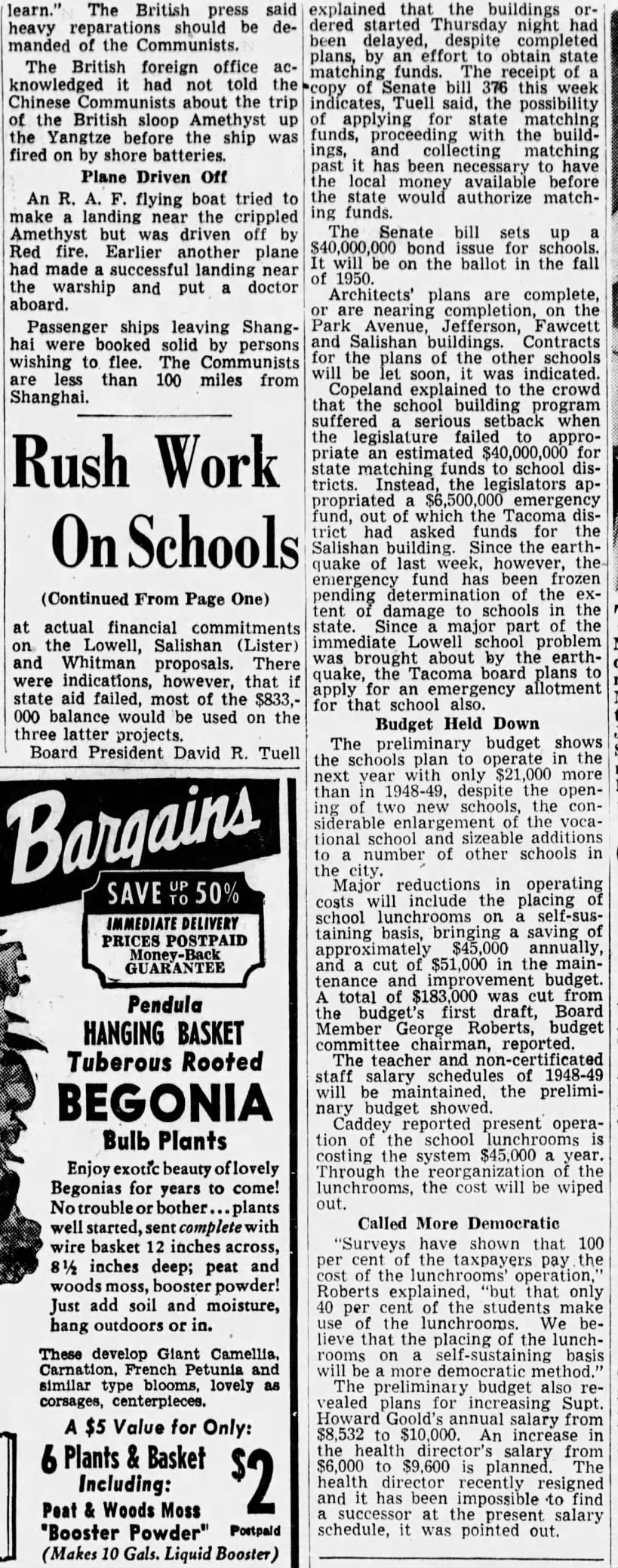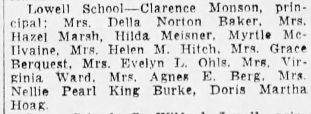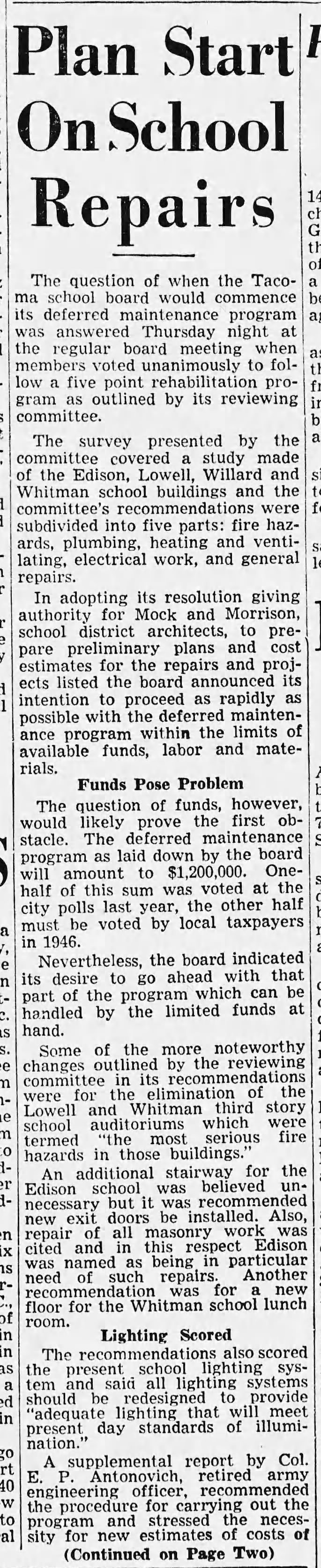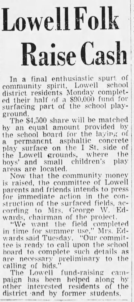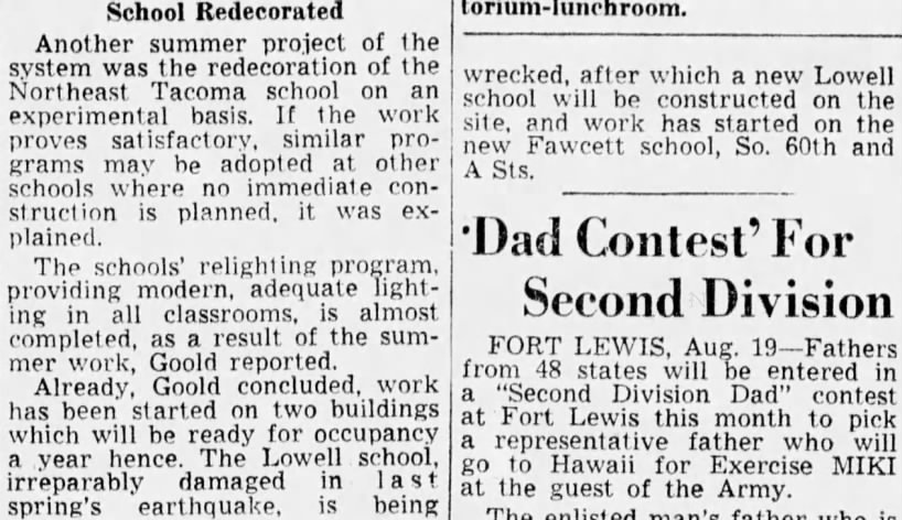 “It was revealed that preliminary directions had been issued to the architects for the drawing of plans for a 10-room replacement for the earthquake-damaged Lowell school. The new Lowell school will also include one kindergarten room, a library, a combination lunchroom and auditorium, offices and an indoor play area in the basement. The board will soon decide, it was indicated, on whether the old building will be razed by the school system or by private contract.”