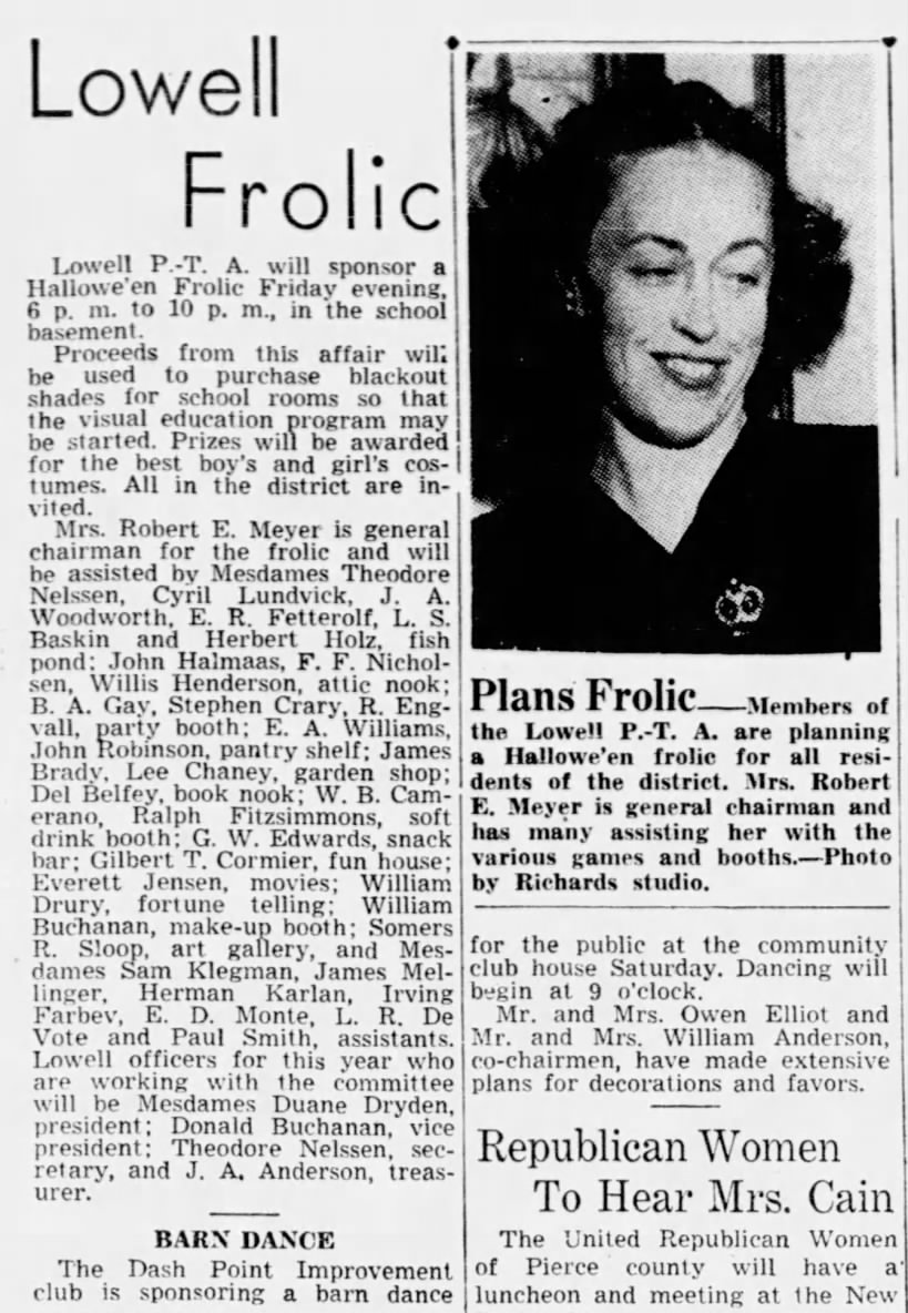 Lowell school plans a “Hallowe’en Frolic” sponsored by the PTA.