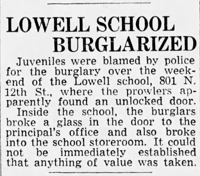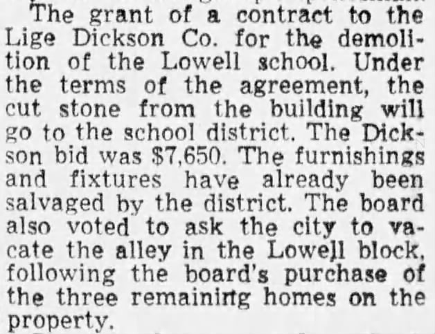 “The demolition of the old Lowell school does not mean there will not be another one to carry on the traditions on the same site. Plans for a new school on the same property are in the making. The year 1950 should see a new and bigger Lowell school started to serve the city as the old one did so faithfully for so many years.”
