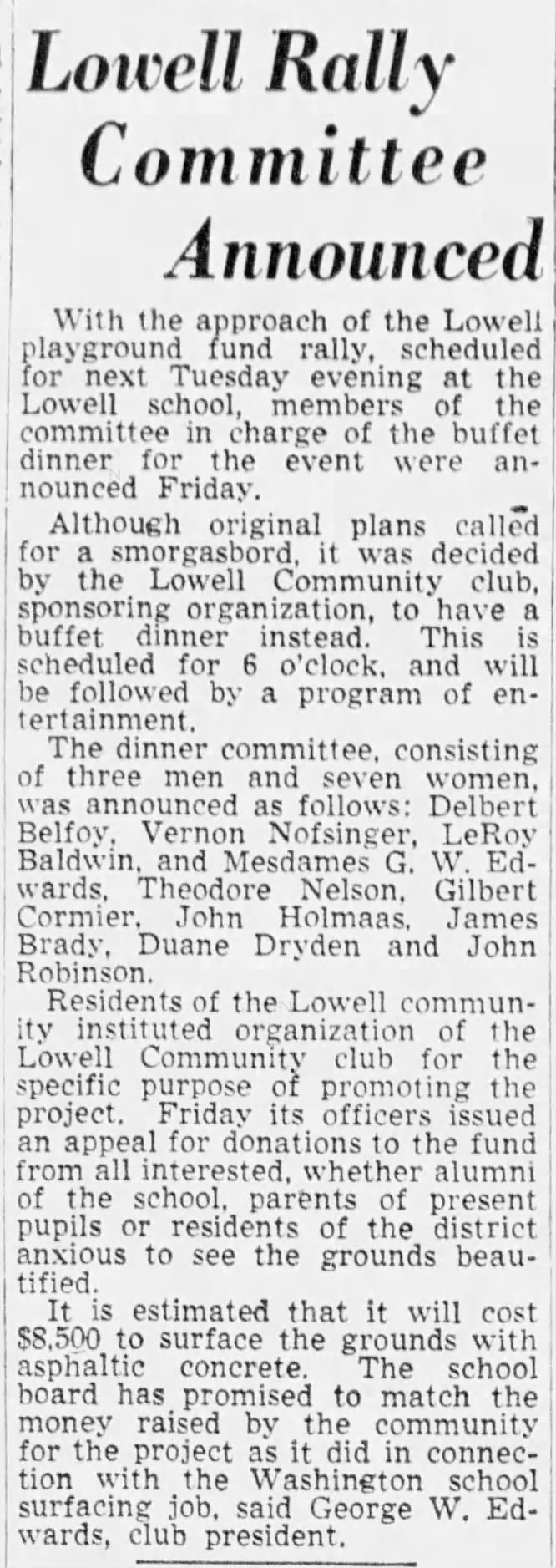 The Lowell Community club makes plans for a rally to raise funds for the paving of the playground and field.