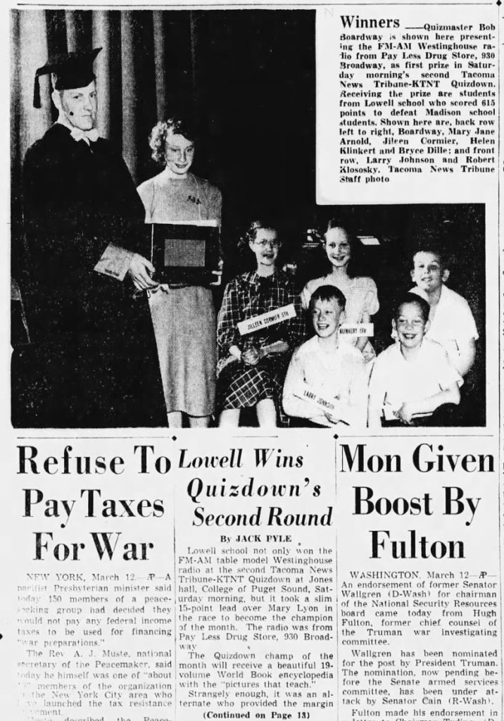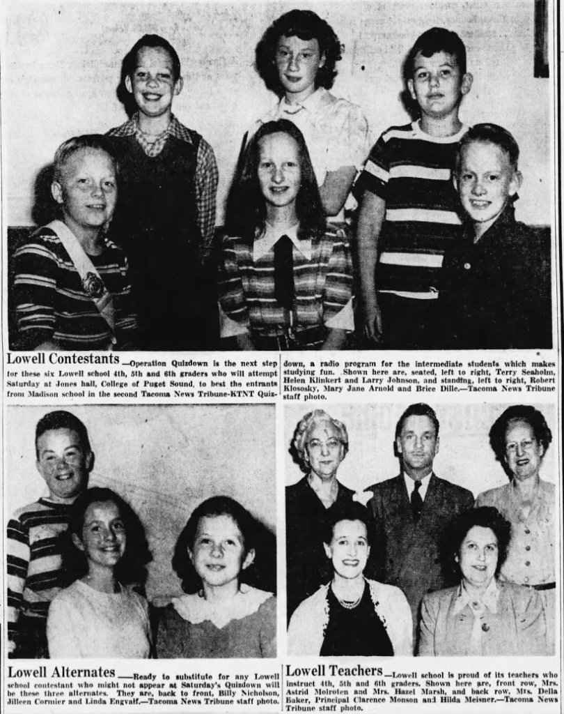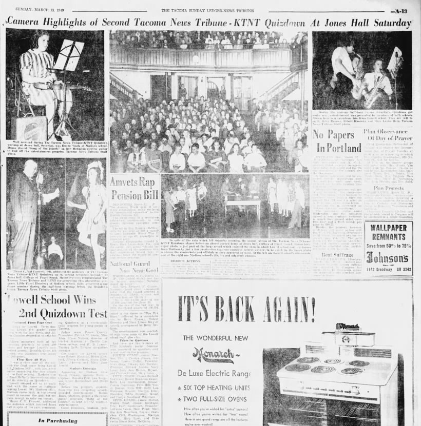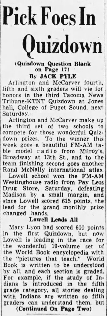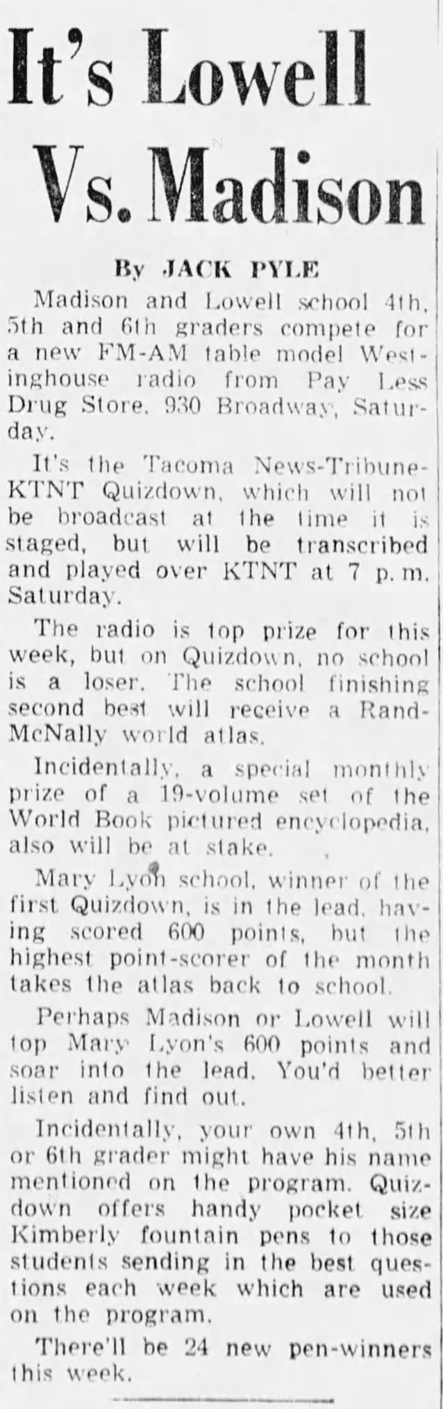Lowell and Madison students battle it out on Quizdown. The top school will win an FM-AM table model Westinghouse radio. The school in second place will win a Rand-McNally world atlas.