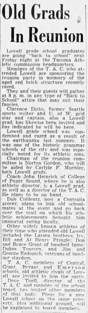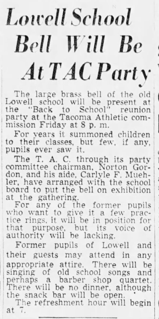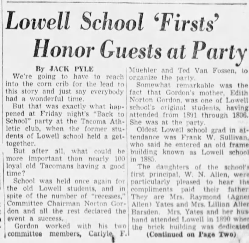 The reunion is quite successful, with the News Tribune estimating there were nearly 100 guests. Students who attended Lowell in the 1890s (and one as as early as 1885) were there, as well as the daughters of former Principal Allen, who was principal of Lowell from 1890-1894.