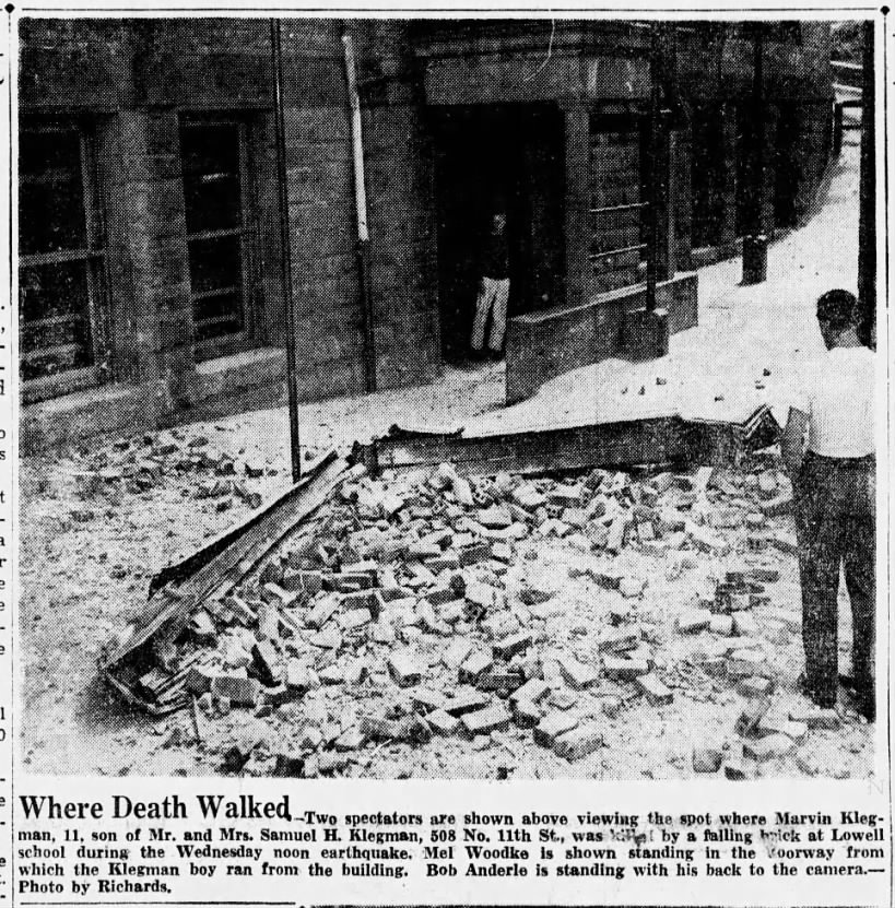 Photo caption: Where Death Walked – Two spectators are shown above viewing the spot where Martin Klegman, 11, son of Mr. and Mrs. Samuel H. Klegman, 508 No. 11th St., was killed by a falling brick at Lowell school during the Wednesday noon earthquake. Mel Woodke is shown standing in the doorway from which the Klegman boy ran from the building. Bob Anderle is standing with his back to the camera. – Photo by Richards.